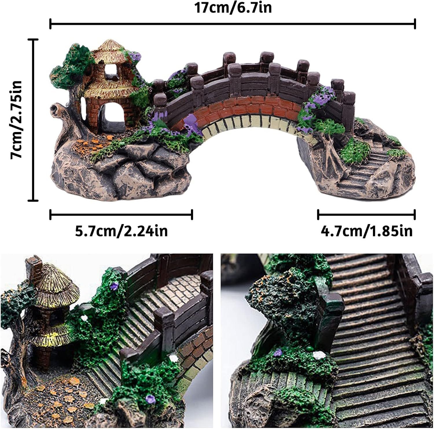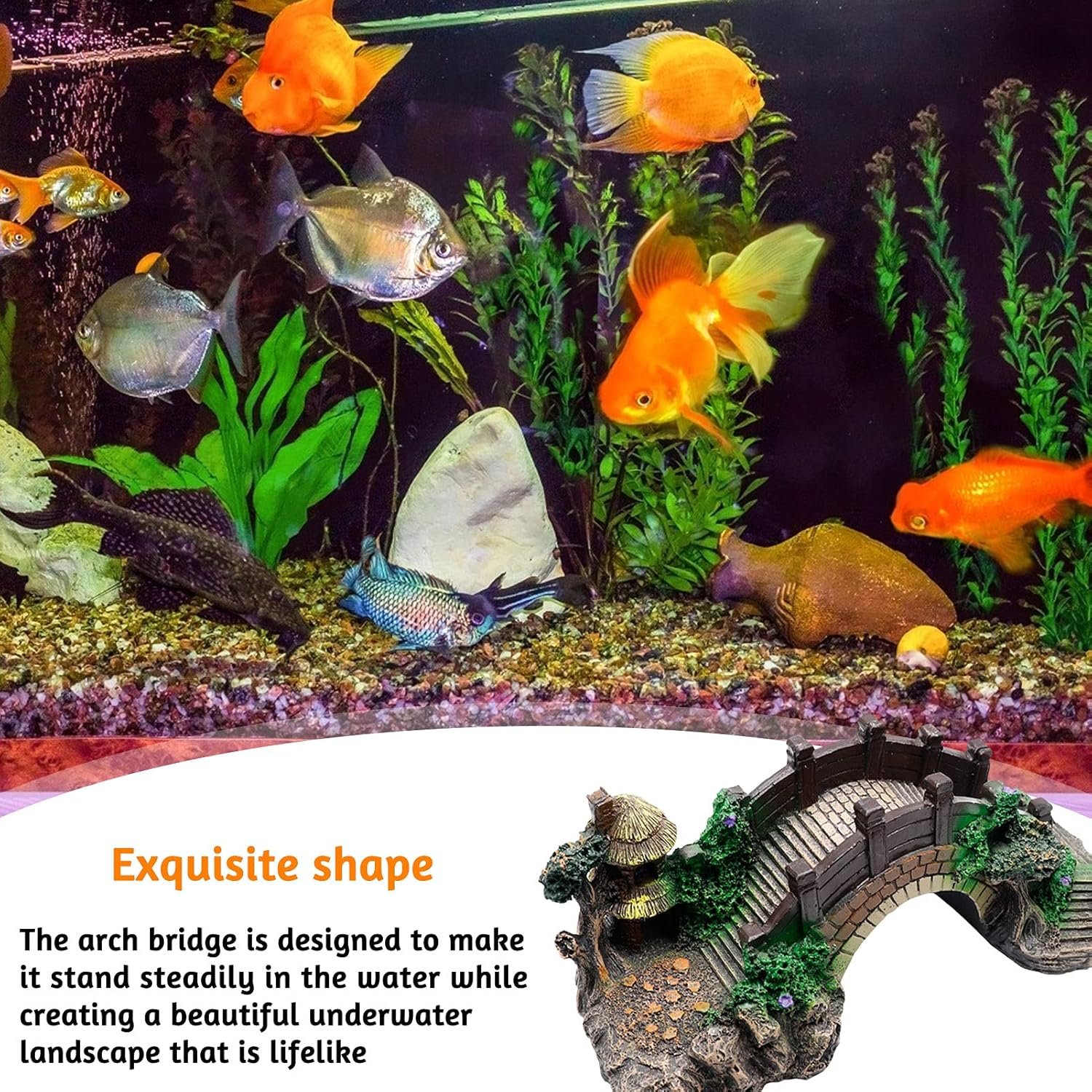 Umweltschutzmaterialien: Die Dekoration des Bogenbrückenaquariums besteht aus Harz. Das Harzmaterial ist ungiftig und umweltfreundlich. Es ist sicher für Fische und Wasser. Es verursacht keine Verschmutzung und Schädigung von Wasserorganismen und verblasst nicht mit der Zeit. Es ist langlebig, verrottet nicht und verursacht keine Algenprobleme.