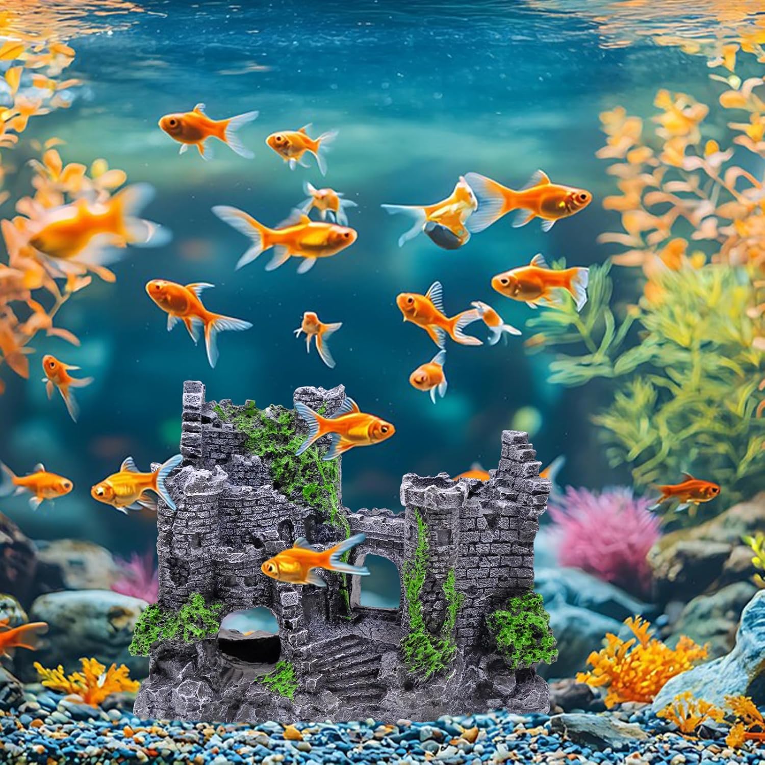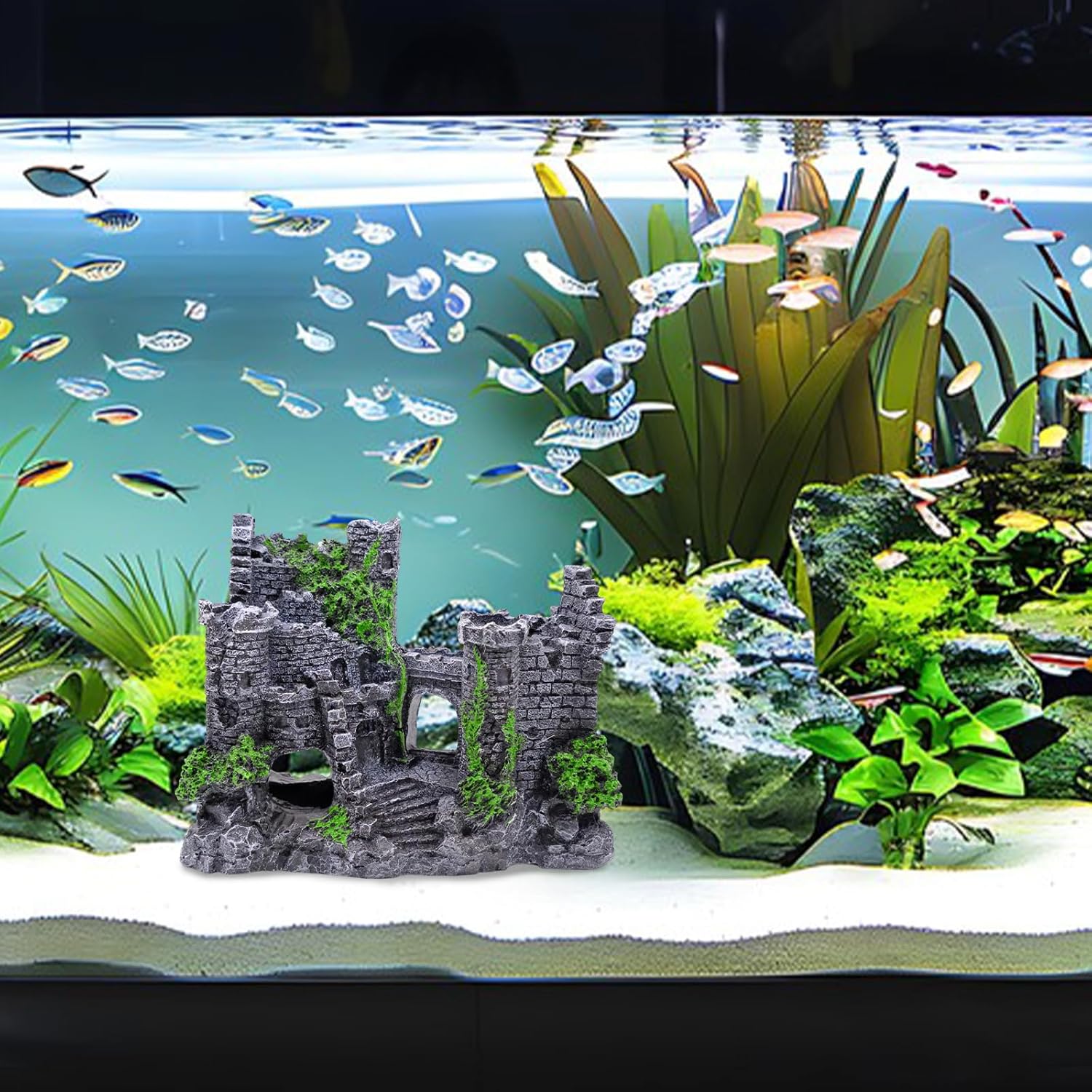 2. Geruch: Aquarium-Ornamente, Harz-Schlossdekorationen können einen leichten Geruch abgeben, der für die Wasserqualität harmlos ist. Legen Sie das Produkt einfach einen Tag lang in Wasser und lassen Sie es dann ein bis zwei Tage lang an einem gut belüfteten Ort an der Luft trocknen, um den Geruch zu beseitigen. Legen Sie das Produkt nach Erhalt 24 Stunden lang in Wasser, bevor Sie es in das Aquarium geben.