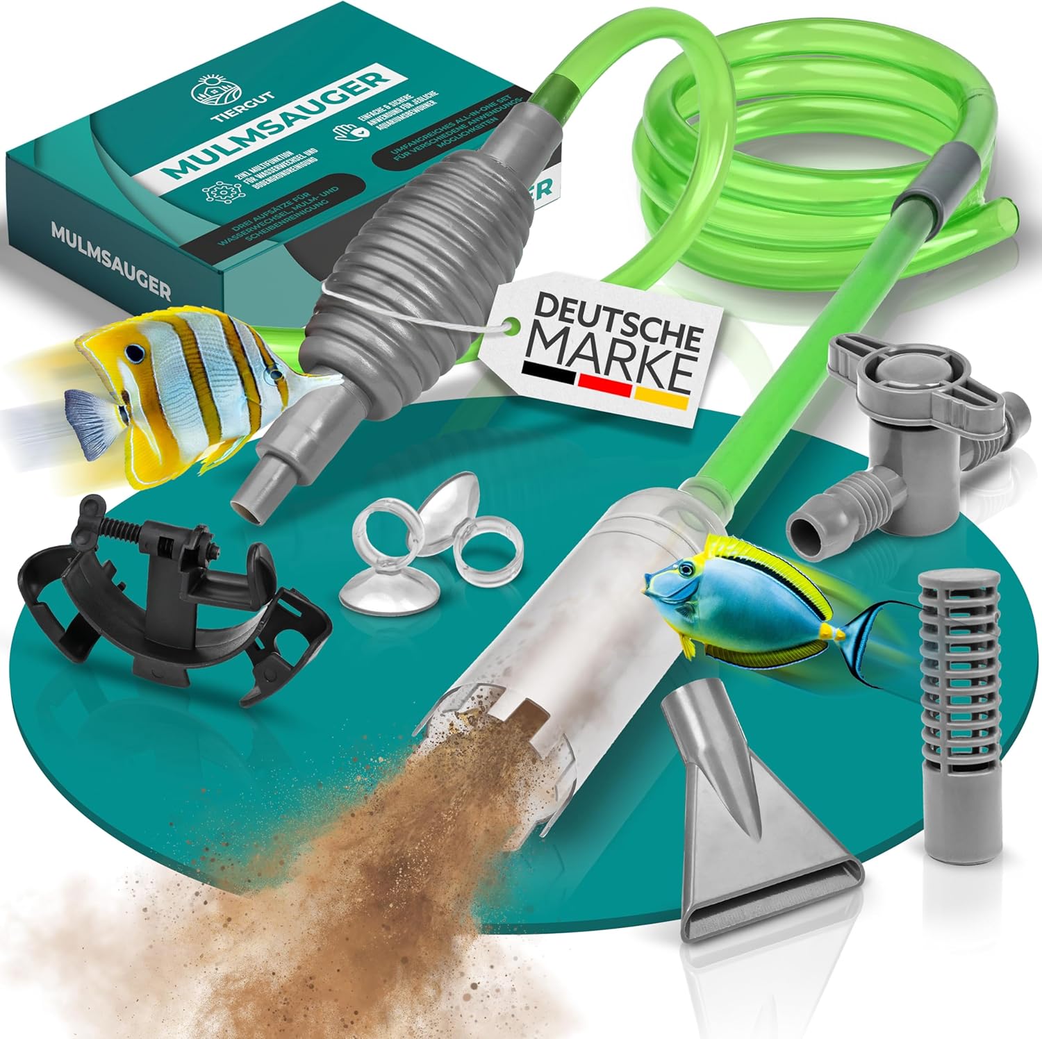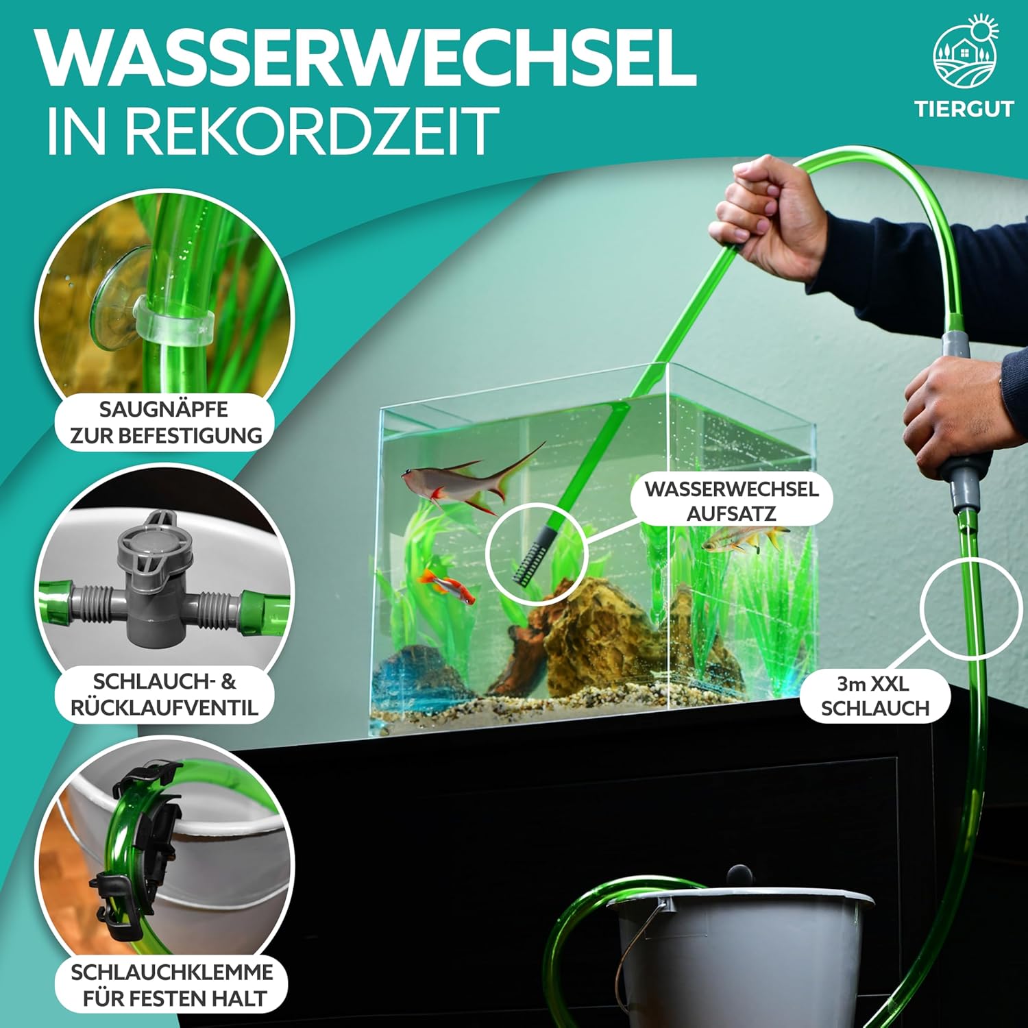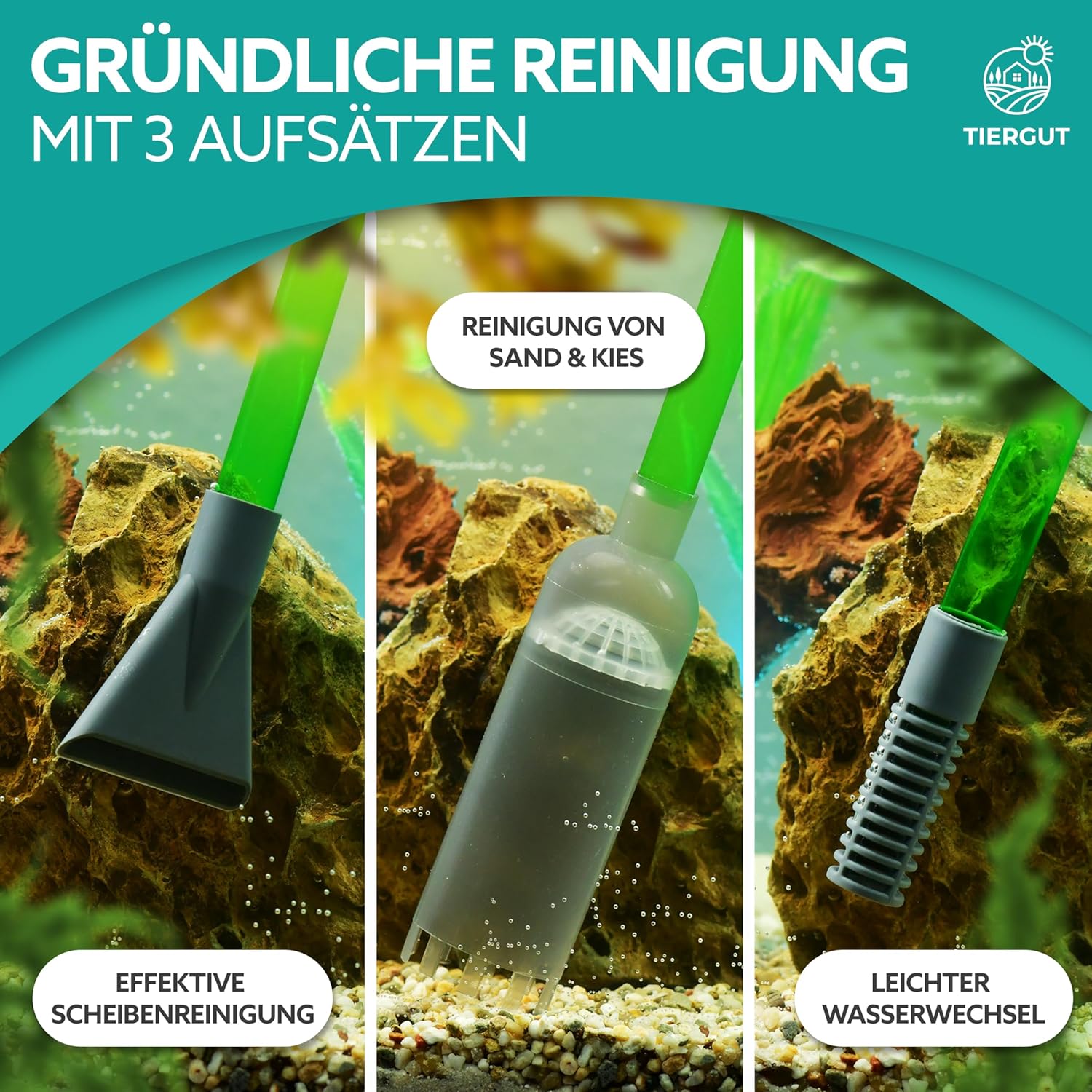 3-in-1-Reiniger – Mit 3 praktischen Funktionen bringt das Tiergut Reinigungsset Ihr Aquarium auf Hochglanz: 1. Staubsauger für den Bodengrund, 2. Manueller Wasserwechsel, 3. Scheibenreiniger