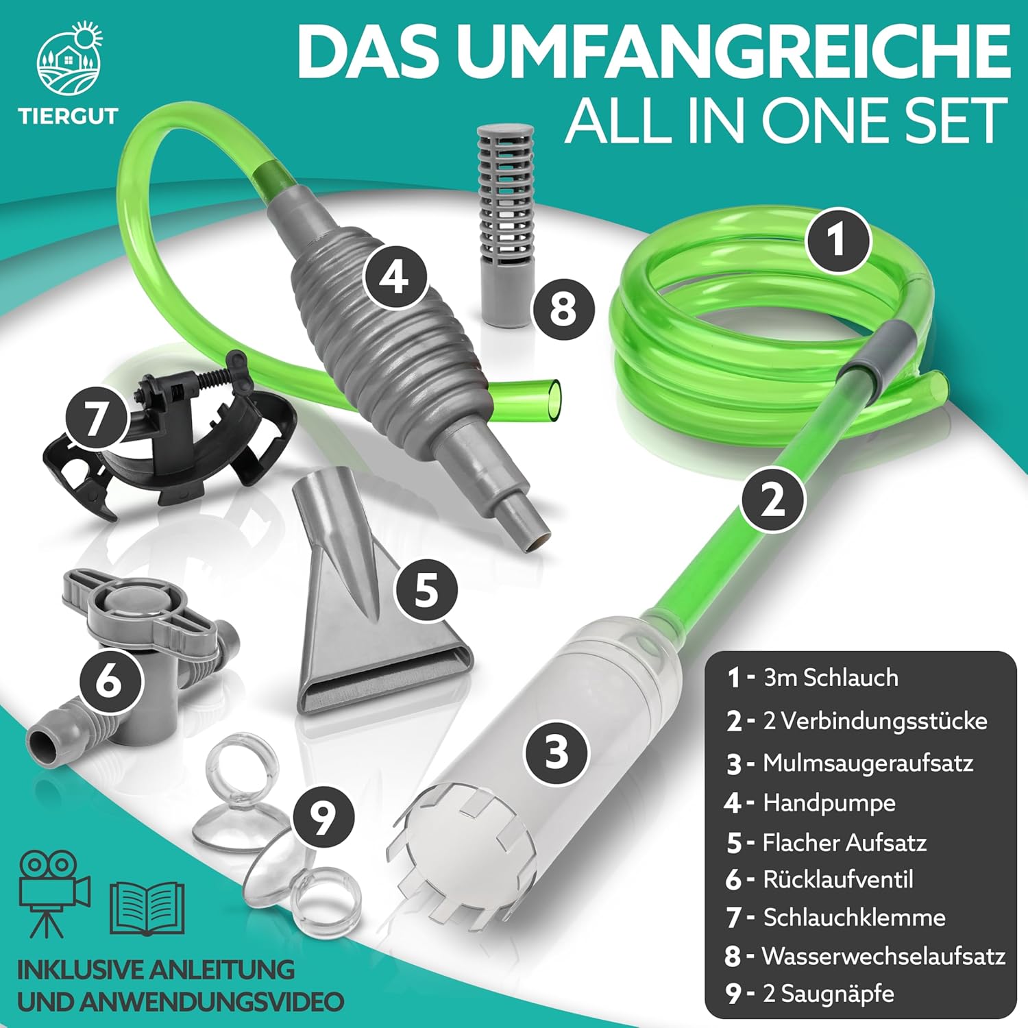 Schneller Wasserwechsel – die Handpumpe, der 3 Meter lange Schlauch, das Rücklaufventil, die Schlauchklemme und zwei Saugnäpfe