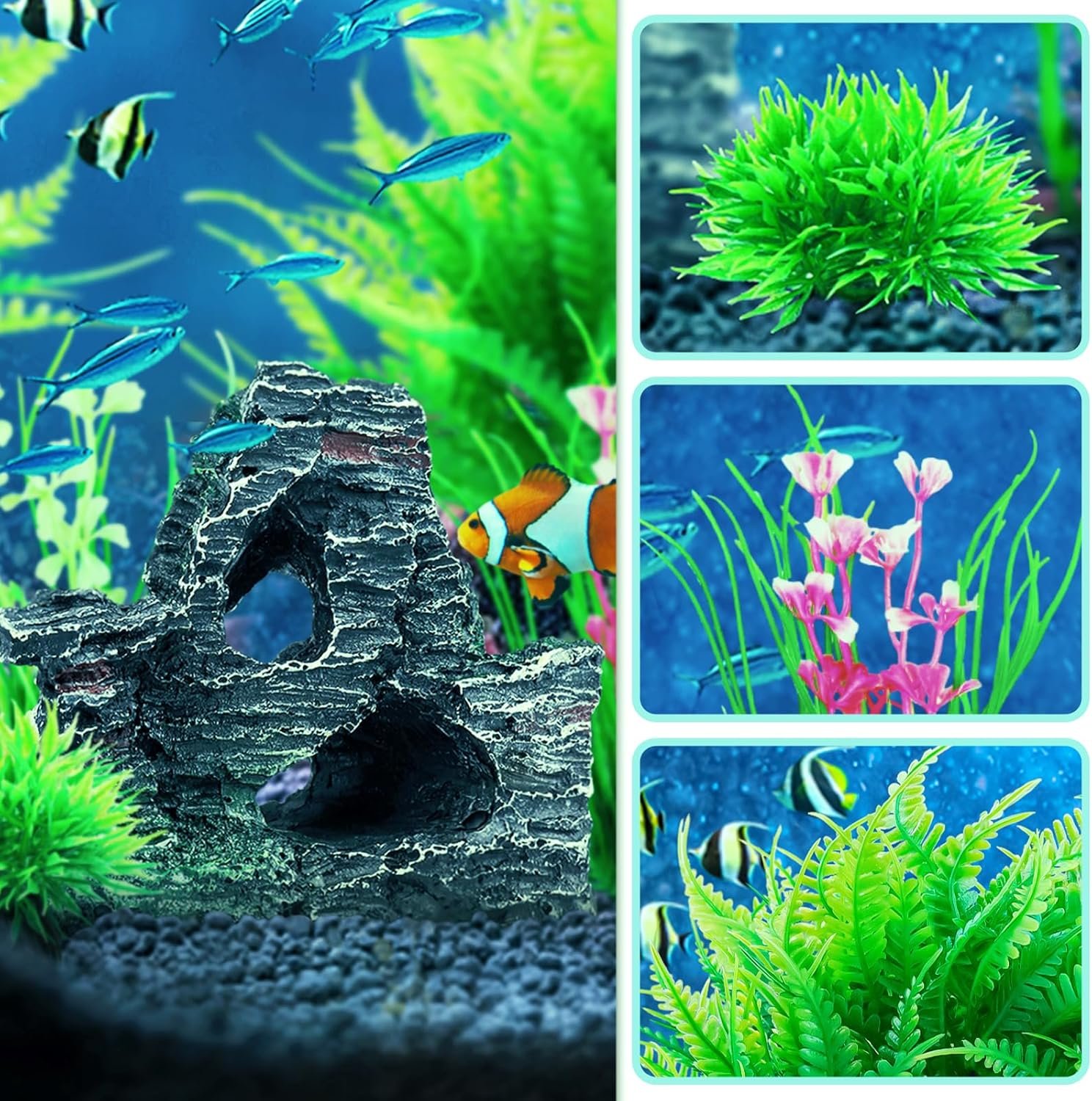 Das Paket beinhaltet: 1 Stück Höhlenaquarium-Ornament und 8 Stück Aquarium-Kunstpflanzendekoration: verschiedene Höhen 5 bis 18 cm.