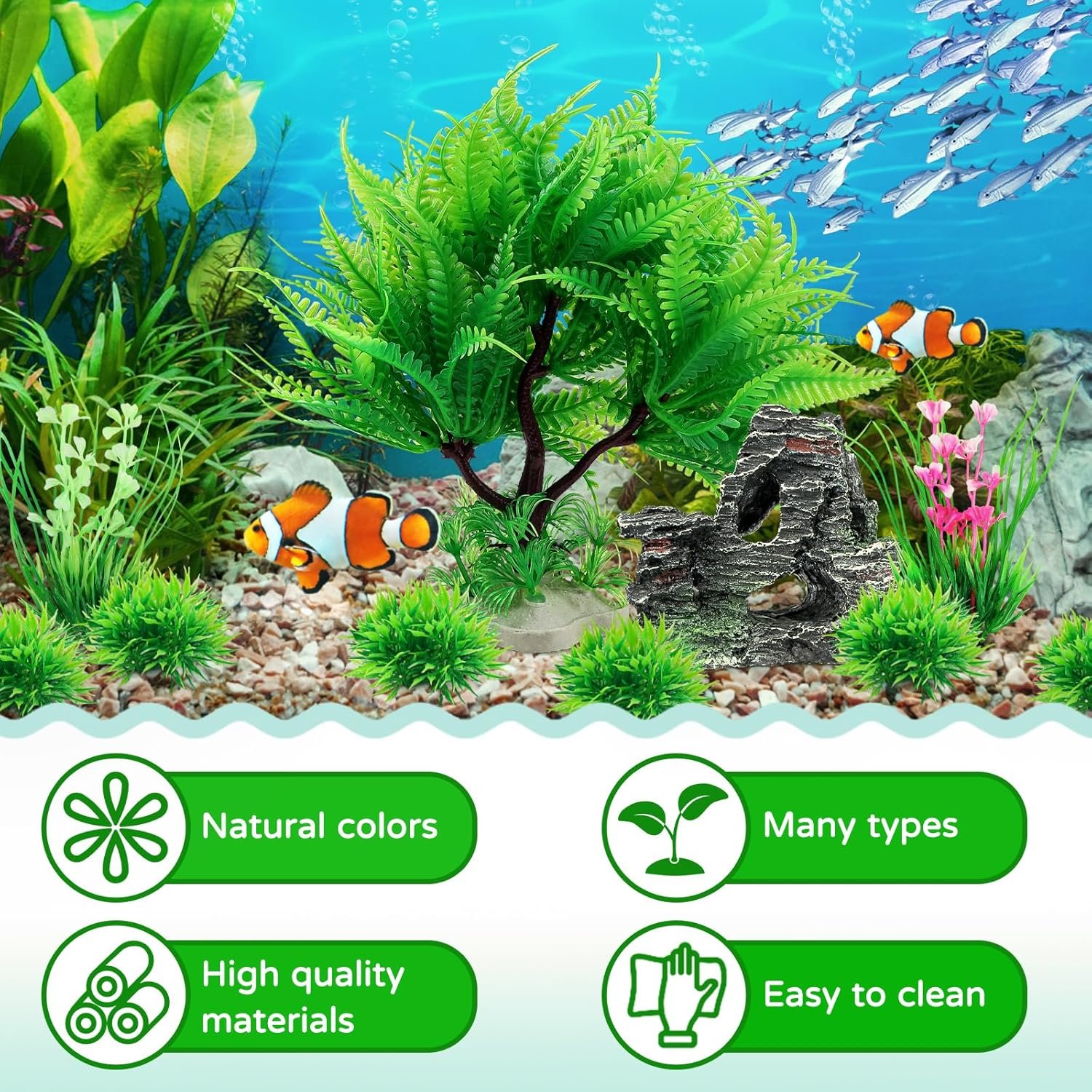 QUOZUO Aquarium-Kunstpflanzen-Dekoration, 9 Stück, grüne Aquarium-Kunststoffpflanzen mit Harzhöhlen-Aquarium-Zubehör