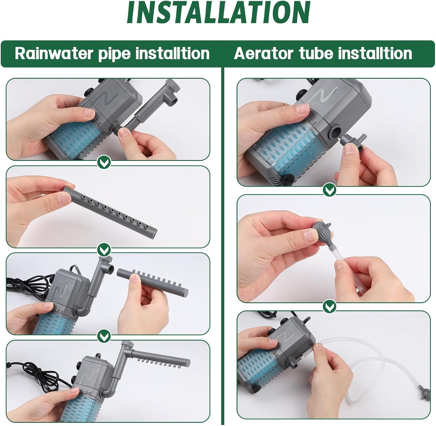 Die Innenfilter-Tauchpumpe ist mit Saugnäpfen ausgestattet, die sie sicher am Glas befestigen und Bewegungen verhindern. Wir empfehlen, die Filterkomponenten, einschließlich Filterschwamm, Filtergehäuse und Schwungrad, regelmäßig zu überprüfen und zu reinigen. Eine monatliche Reinigung wird empfohlen.