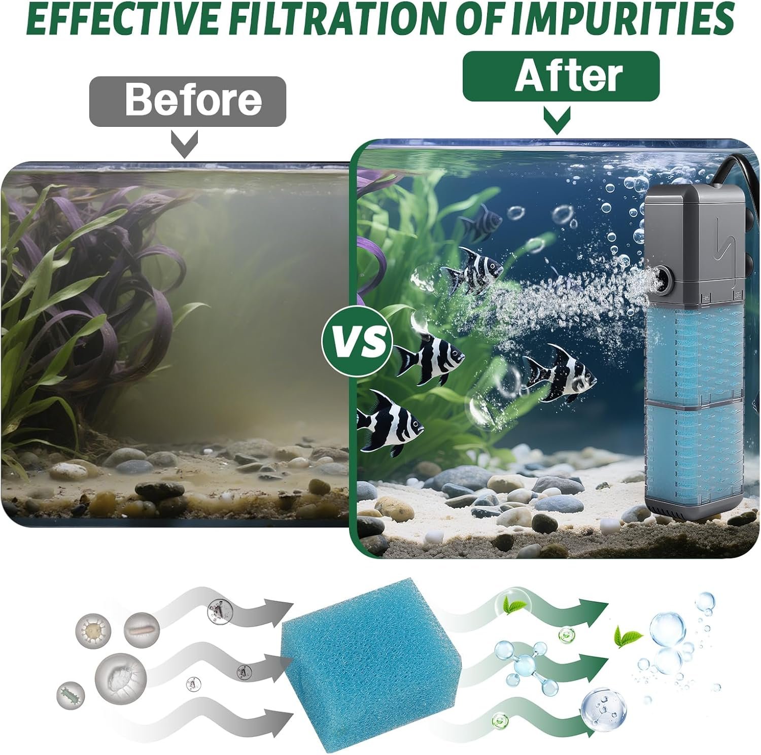 Unsere Tauch-Aquarienfilter sind vielseitig einsetzbar, sie erzeugen Wellen und erhöhen den Sauerstoffgehalt des Wassers durch den Schirm-Auslassmodus und den Sprudel-Auslassmodus, mit wellenbildenden und sauerstoffproduzierenden Funktionen, und insbesondere durch die eingebauten hochwertigen Filterschwämme, die alle Arten von Verunreinigungen im Wasser, wie z. B. Fischausscheidungen, Reste von Fischfutter und -zubehör und andere Verunreinigungen, effektiv adsorbieren und die Wasserqualität verbessern