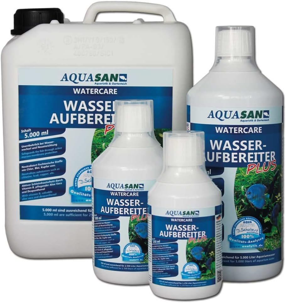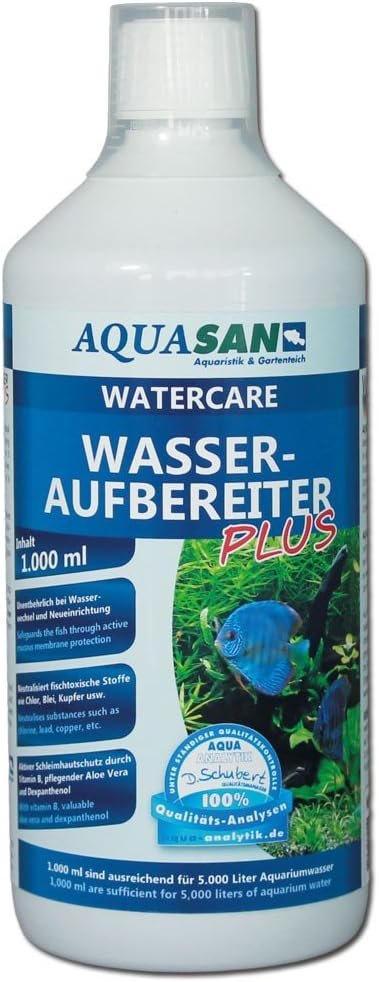 Aquasan WaterCare Wasseraufbereiter plus ist das ideale Pflegemittel bei Neueinrichtung und Wasserwechsel im Aquarium. Denn herkömmliches Leitungswasser ist kein fischfreundliches Aquarienwasser. Es kann fischaggressive Stoffe wie Chlor, Kupfer, Blei und andere Schwermetalle transportieren. Darüber hinaus wirkt Leitungswasser aggressiv auf die Schleimhäute. Aquasan WaterCare Wasseraufbereiter Plus neutralisiert diese Stoffe und wandelt herkömmliches Leitungswasser in fischfreundliches Aquarienwasser um. Darüber hinaus enthält es wertvolle Schutzkolloide, Aloe Vera und Dexpanthenol zum Schutz Ihrer Fischschleimhaut. Auch bei einer Neugewöhnung von Fischen aus dem Zoo-Fachhandel im heimischen Aquarium kann es eine beruhigende und stressreduzierende Wirkung auf die neuen Bewohner haben. Deshalb darf der Aquasan WaterCare Wasseraufbereiter Plus bei keinem Wasserwechsel, bei der Reinigung im Aquarium oder bei der Gewöhnung an die Fische fehlen. Bei einmal wöchentlicher Anwendung ist es ein idealer Schutz für Ihre Fische!