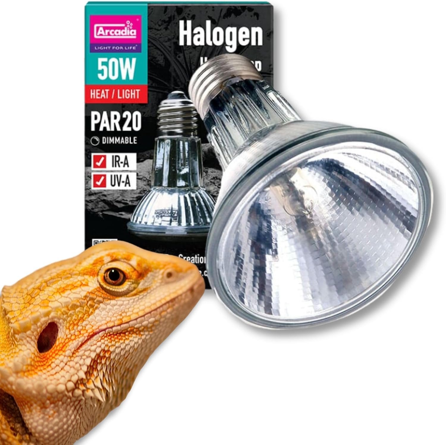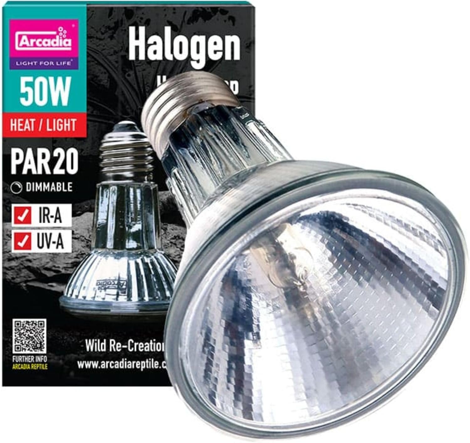 Der Halogen Basking Spot ist eine hocheffiziente Licht- und Wärmequelle – die ideale Ergänzung zu Quecksilberdampflampen mit integriertem Vorschaltgerät oder Leuchtstoffröhren für Reptilien. Die Arcadia-Halogen-Sonnenstrahler sind ein großer Fortschritt auf der Suche nach einer Beleuchtung, die gleichzeitig Wärme- und Lichtquelle ist und wenig Energie verbraucht. In der Vergangenheit mussten Reptilienhalter altmodische Wolfram-Halogenlampen verwenden, um Wärme und Licht ohne UV-Strahlung zu erzeugen. Diese Lampen waren nicht nur energetisch sehr nachteilig, sie waren aufgrund ihrer fragilen Bauweise auch nicht sehr langlebig. Halogen ist eine sehr energieeffiziente Licht- und Wärmequelle. Eine 50-W-Halogen-Glühlampe von Arcadia erzeugt die gleiche Menge an Licht und Wärme wie eine 100-W-Halogenlampe. Die mit Halogengas gefüllte Glühkapsel in der Lampe erzeugt ein sehr warmes, natürliches Licht und eine gesunde Wärmemenge mit idealen Wärmeentfernungsverhältnissen. Darüber hinaus benötigen Sie kein Wolfram-Filament und können daher wesentlich länger verwendet werden. Die Lampe ist außerdem mit einem hochwertigen Innenreflektor ausgestattet, der Licht und Wärme, die sonst seitlich und hinten an der Lampe entweichen würden, nach vorne reflektiert und so die Leistung der Lampe weiter erhöht. Vereinfacht gesagt spart die Arcadia-Halogen-Solarlampe Energiekosten und häufige Lampenwechsel und schont so Ihren Geldbeutel. Sie lassen sich exakt auf die gewünschte Wärmezone ausrichten und schaffen so einen idealen Sonnenbereich. Dank der Dimmbarkeit können Sie die gewünschte Wärme- und Lichtmenge genau steuern. Die Arcadia Halogen Basking Spotlights sind die ideale Ergänzung zur Arcadia D3 Basking Lamp und den preisgekrönten Hochleistungs-T5-Reptilien-Leuchtstoffröhren.
