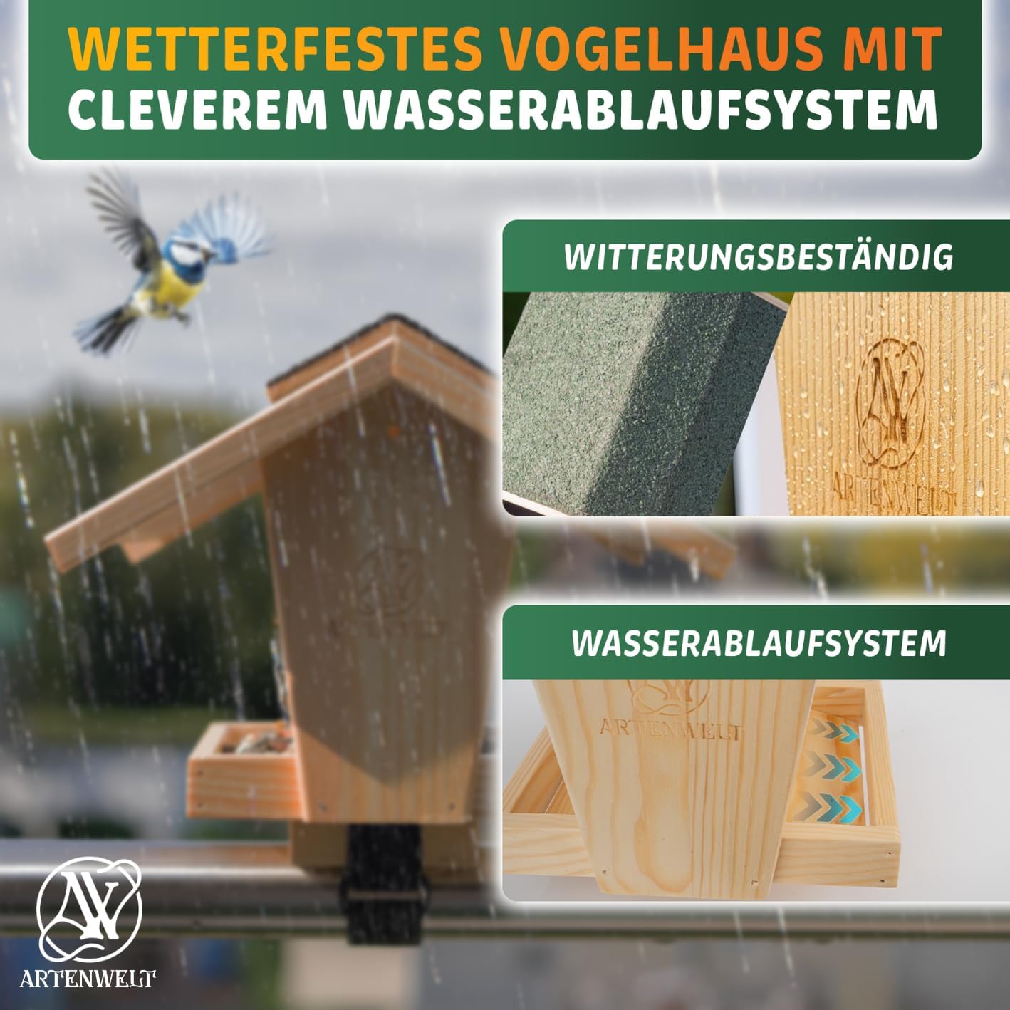 Wasserablaufsystem: Bei starkem Regen sorgt unser ausgeklügeltes System dafür, dass angesammeltes Wasser schnell aus dem Vogelfutterhaus abfließen kann. Das Futter trocknet schneller.