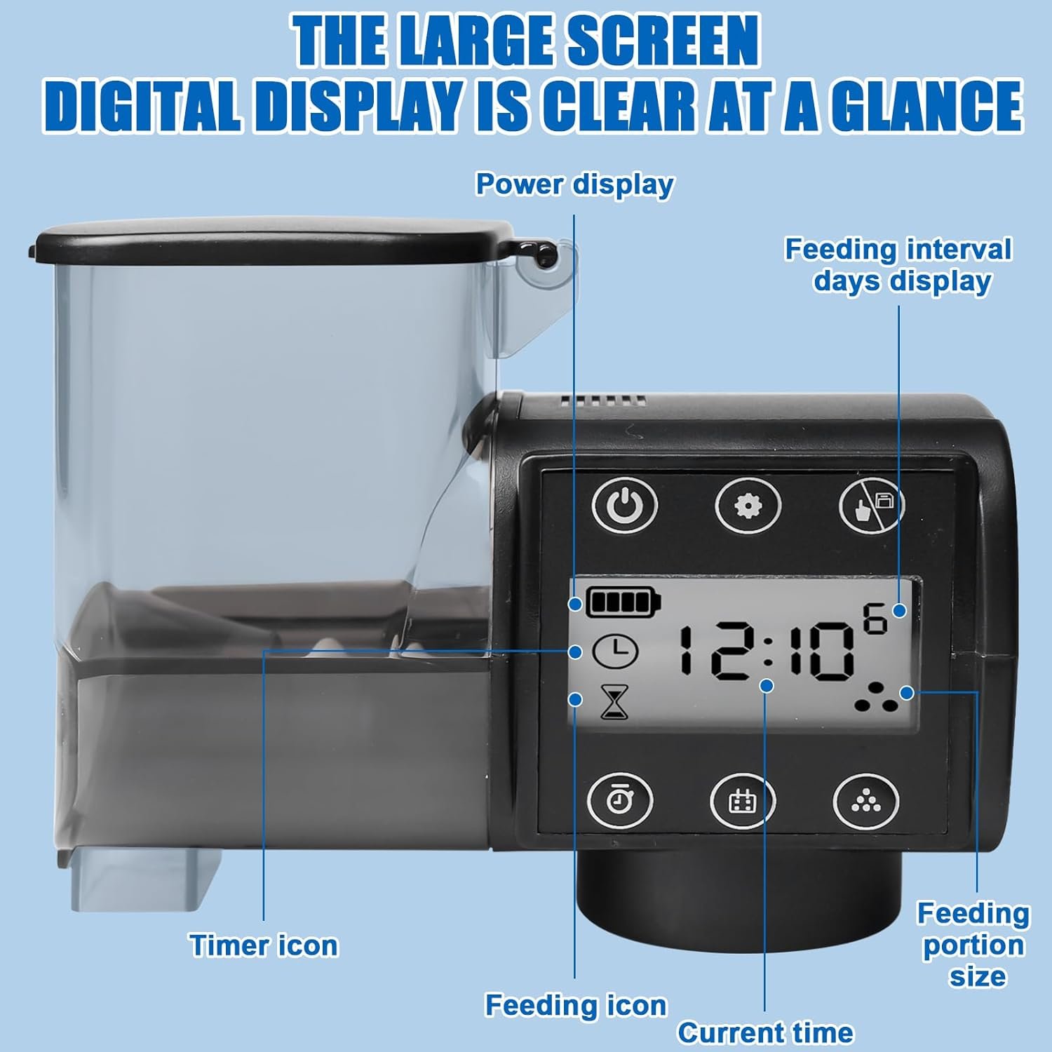 LCD-Bildschirm: Die Uhr, die Fütterungsparameter und die Batterieleistungsanzeige werden auf dem Bildschirm angezeigt, was das Füttern erleichtert. Das automatische Futteraquarium wird mit einer Batterie betrieben (im Lieferumfang enthalten), perfekt für den täglichen Gebrauch und den Urlaub