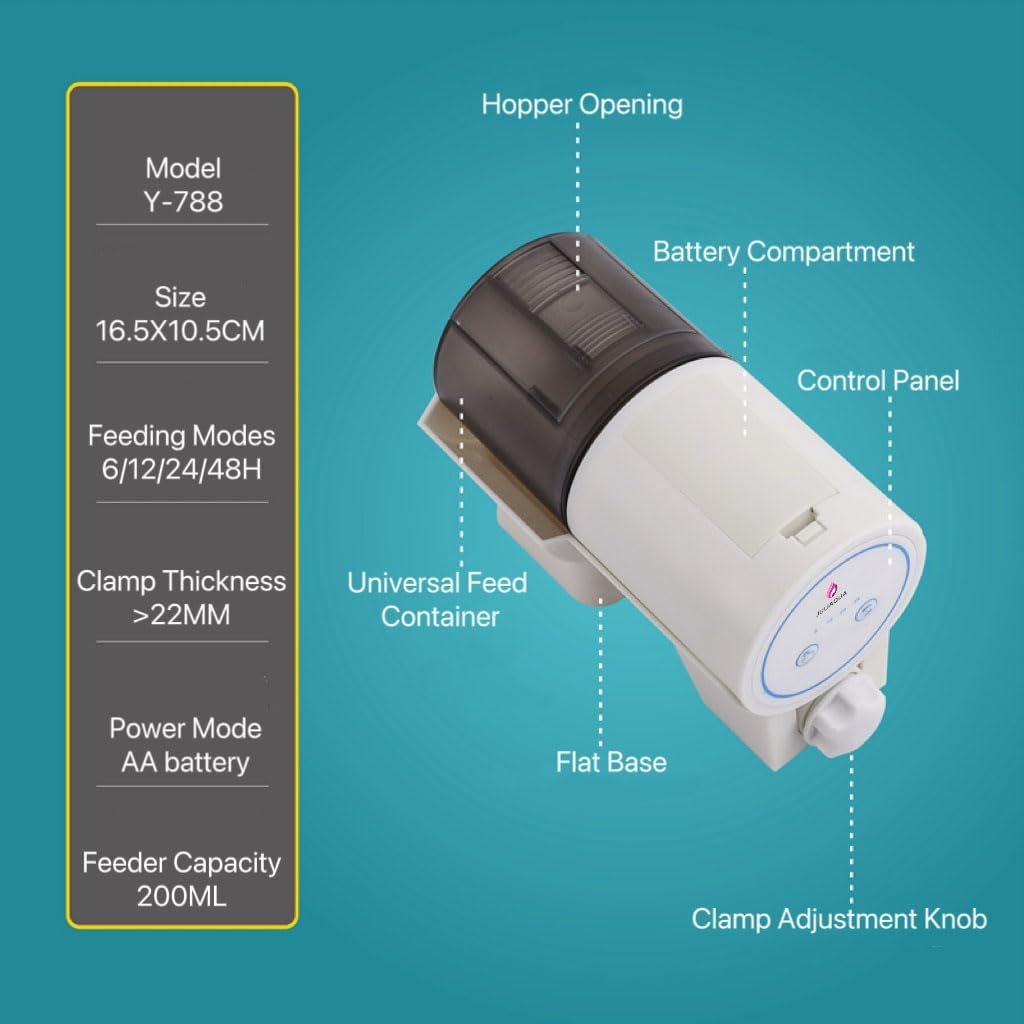 Einstellbares Futtervolumen und 200 ml großes Fassungsvermögen: Der automatische Aquarium-Futterspender kann die Futtermenge durch Einstellen des Schiebereglers anpassen, sodass Sie die Futtermenge einfach steuern können. Der automatische Fischfutterautomat hat ein Fassungsvermögen von 200 ml. Das Gerät kann zu bestimmten Zeiten, wenn Sie reisen oder ausgehen, Fische, Schildkröten und Frösche füttern