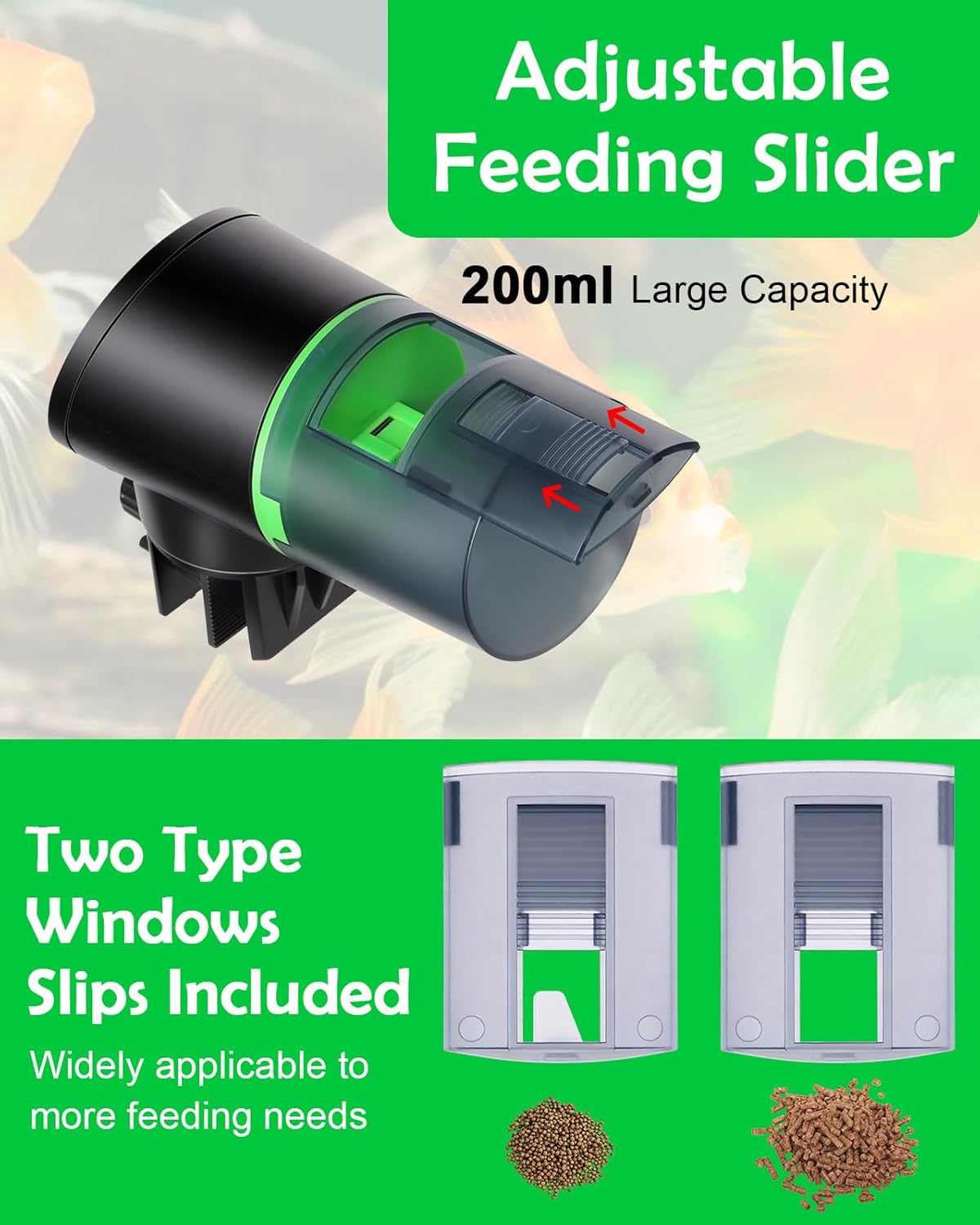 200 ml großes Fassungsvermögen und einstellbare Futtermenge: Das Petbank-Automatikfutter-Aquarium bietet 200 ml großes Fassungsvermögen und eignet sich für verschiedene Fischgerichte wie Flocken, Pellets, Pulver und Streifen. Passen Sie den Schieberegler an, um die Futtermenge für Ihre Fische zu steuern