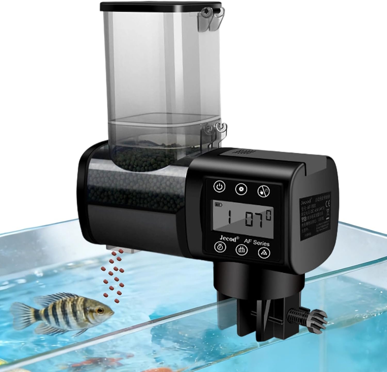 Zwei Montagemöglichkeiten: Es kann mit einem Clip am Rand des Aquariums befestigt oder mit dem Sockel auf die Aquarienabdeckung mit Futterloch gestellt werden.
