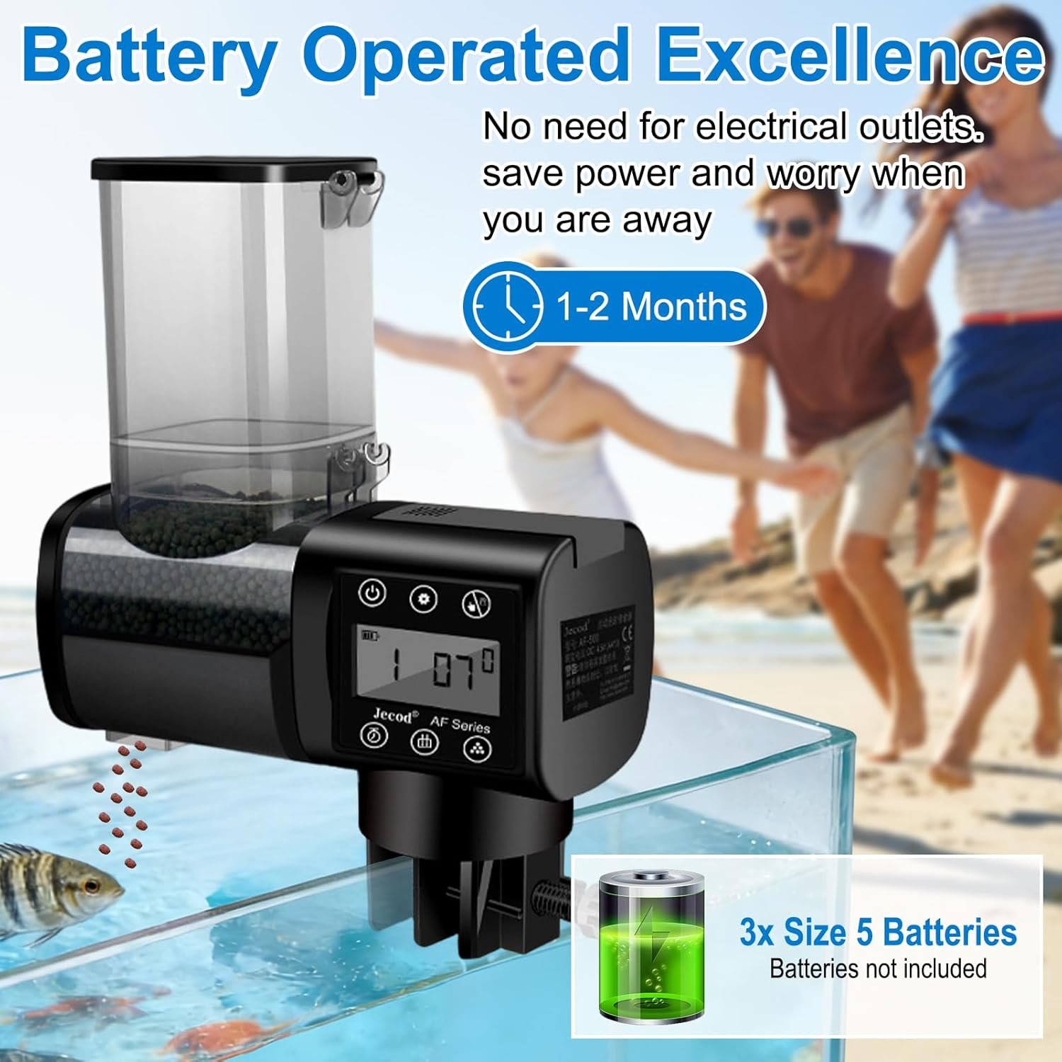Zuverlässiger Batteriebetrieb und LCD-Display: Der Fischfutterspender wird mit 3 AA-Batterien betrieben (nicht im Lieferumfang enthalten). Da kein Stromanschluss erforderlich ist, funktioniert es auch bei Stromausfall oder Abwesenheit zuverlässig – und ist somit äußerst mobil und einsatzbereit. Das LCD-Display zeigt Batteriestand, Uhrzeit und Fütterungseinstellungen an. Es warnt Sie rechtzeitig vor dem Batteriewechsel und gibt Ihnen Sicherheit auf Reisen. So können Ihre Fische jeden Tag sorgenfrei fressen und ihre Gesundheit schützen.