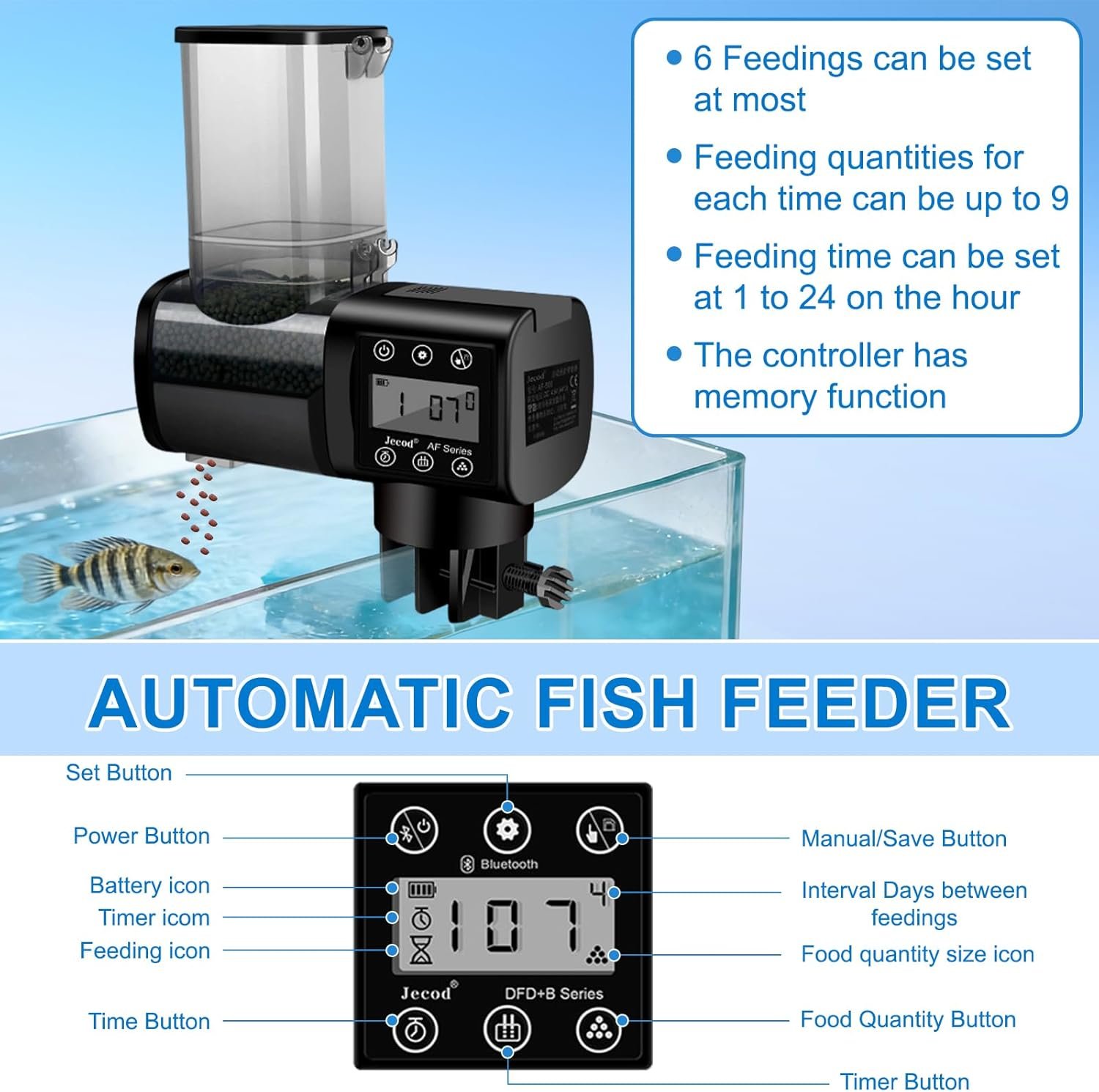Individuelle Fütterungszeit: Der übersichtliche LCD-Bildschirm dieses automatischen Fischfutterautomaten ist mit einer Uhr ausgestattet, mit der Sie die Ortszeit einstellen können. Sie können bis zu 6 Fütterungszeiten pro Tag programmieren. Jede Fütterungszeit kann auf bis zu 9 Fütterungsmengen à 2 Sekunden eingestellt werden, um Ihren individuellen Fütterungsbedürfnissen gerecht zu werden. Wenn Sie die Fütterung manuell durchführen möchten, drücken Sie einfach die Taste für die manuelle Fütterung und genießen Sie den Spaß am Füttern.