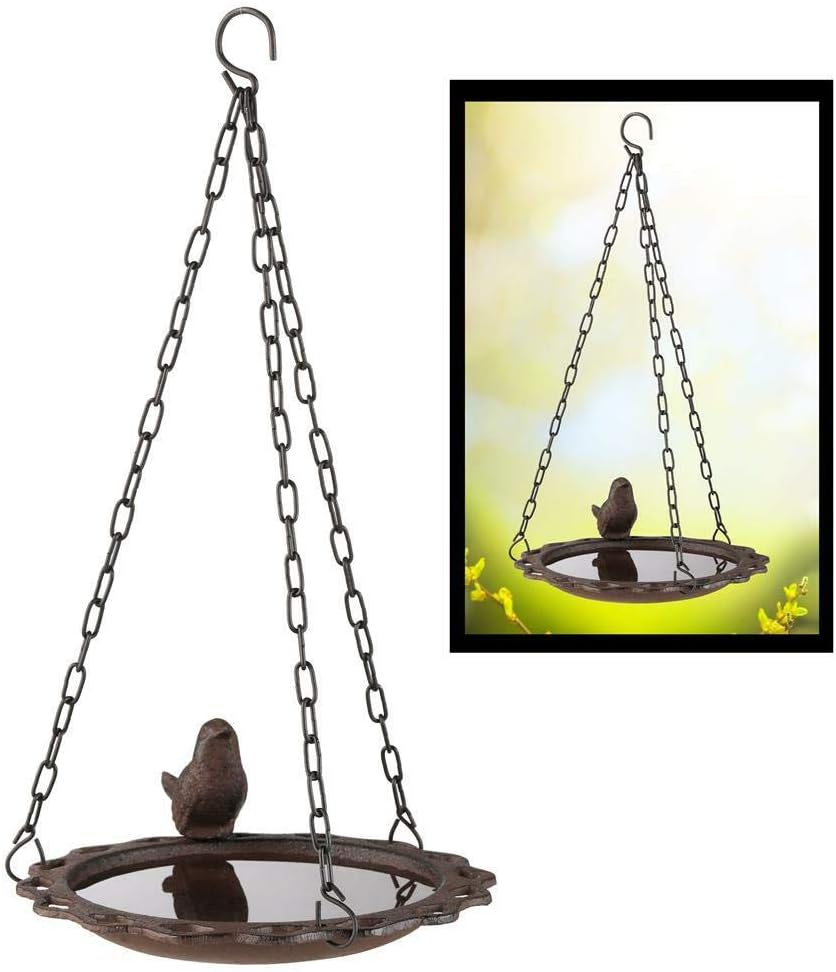 Eine nützliche und schöne Vogeltränke zum Hängen für ihren Garten oder Balkon Die Bambelaa! Vogeltränke Gusseisen kann als Wasserschale, wie auch als Futterspender genutzt werden. Die Schale eignet sich nicht nur als Tränke oder Badewanne für verschiedene heimische Wildvogelarten, wie Hausmeisen, Sperlinge und Amseln, sondern dient auch gleichzeitig zur Wasseraufnahme für Bienen und andere nützliche Insekten. Durch diese kleine gezielte Maßnahme können wir einzelne Vogelarten, sowie Bienenarten in ihrem Bestand unterstützen. Ein Vogelbecken oder auch Futterschale, liefern einen wichtigen Beitrag zur Stützung der innerörtlichen Vogel- und Bienenpopulation. Das antike runde braune Vogelbad zum Hängen, ohne Stab im Vintage Design, ist auch eine schöne Deko für ihren Garten. Es fehlen die Maße ca. 20,5 x 19 x 36,5 cm, ist zum Aufhängen, ist frostsicher aus Gusseisen gefertigt, daher winterhart, frostsicher und wetterfest, somit kann die Hängeschale von Frühling bis Winter ganzjährig im Freien genutzt werden. Auf dem blütenförmigen Tellerrand der Tränke sitzt ein Vogel. Zudem besitzt sie keinen Ständer und darf nicht in den Gartenboden gesteckt werden. An der Tränke sind drei massive Ketten mit einem Haken befestigt, sodass sich die Schale mit der Kette frei hängend an einem Ast eines Baumes oder einer anderen Stelle befestigen lässt. Außerdem lassen sich die Vögel dadurch hervorragend beobachten. Halten Sie genügend Abstand, wenn Sie die Vögel beobachten möchten, damit sich diese in ihrer natürlichen Umgebung nicht gestört fühlen. Daher ist die Vogel Wasserschale das perfekte Accessoire für Ihren Garten oder Balkon. Lieferumfang: 1x dekorative Vogeltränke Vogelbadewanne Gusseisen hängend / Futterstelle aus Gußeisen mit Aufhängung ohne Ständer ca. 20,5 * 19 * 36,5 cm für Vögel und Bienen / Insekten