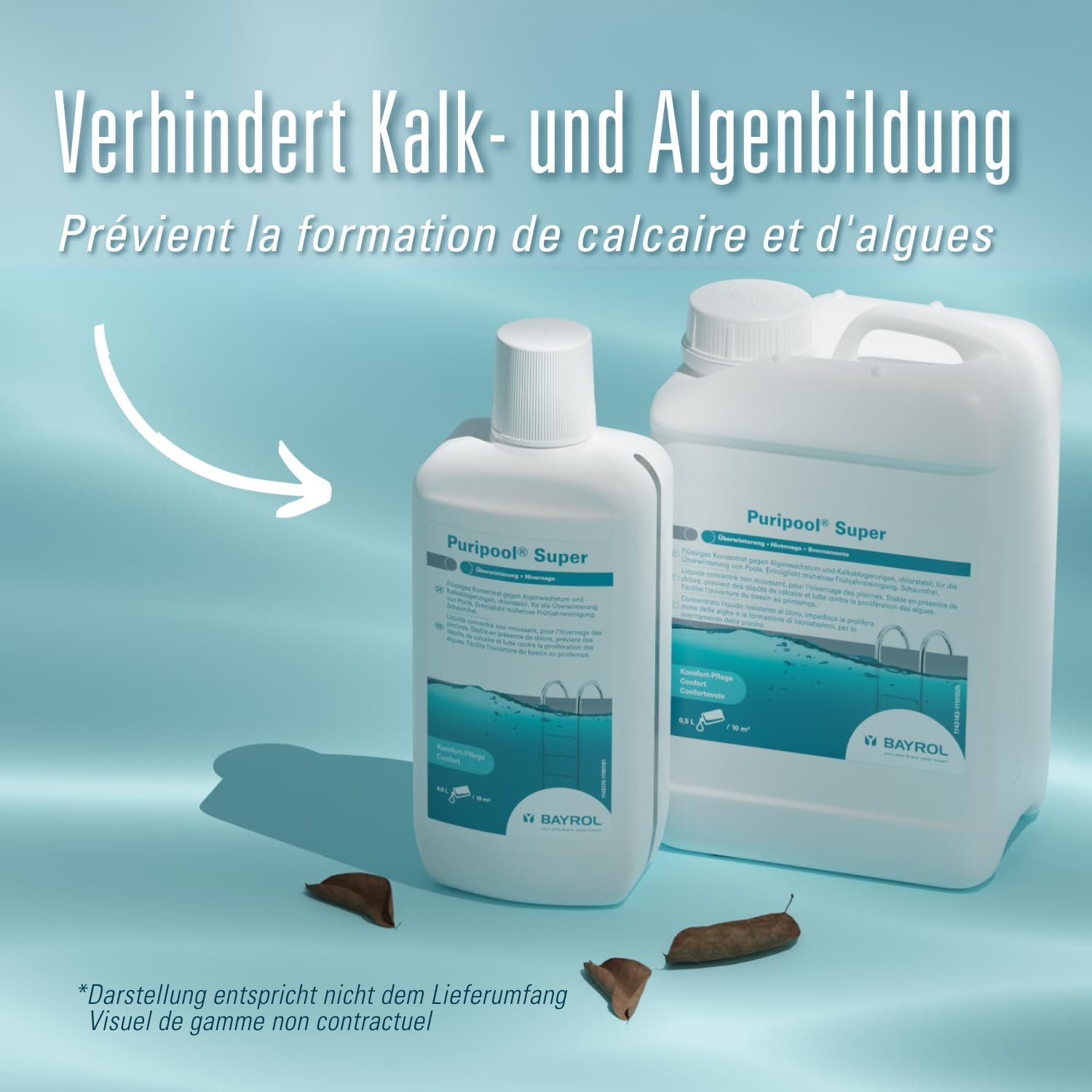 Puripool Super ist eine chlorstabile, schaumfreie Flüssigkeit zur Vorbeugung von Algenwachstum, Kalk und anderen Schmutzablagerungen im Pool während der Überwinterung. Dies erleichtert den Frühjahrsputz erheblich.