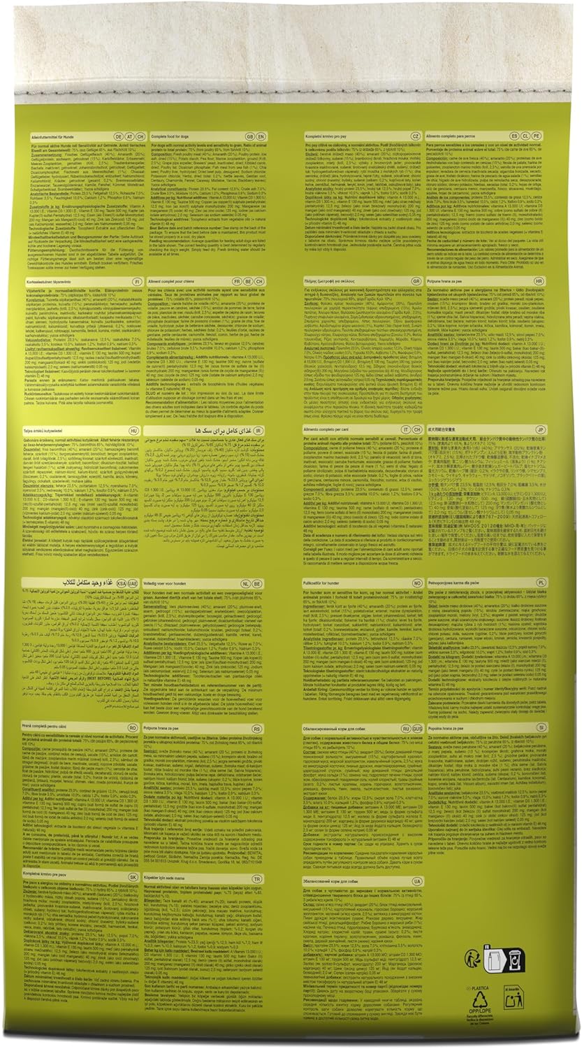 Empfohlene Verwendung: Aufgrund des begrenzten Protein- und Fettgehalts sowie des Verzichts auf Getreide ist diese Formel für erwachsene, normal aktive Hunde mit einer Getreideunverträglichkeit geeignet.