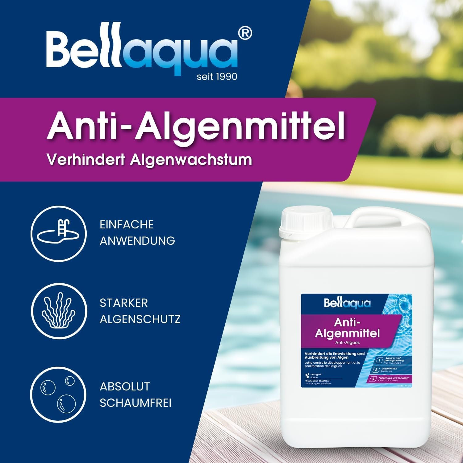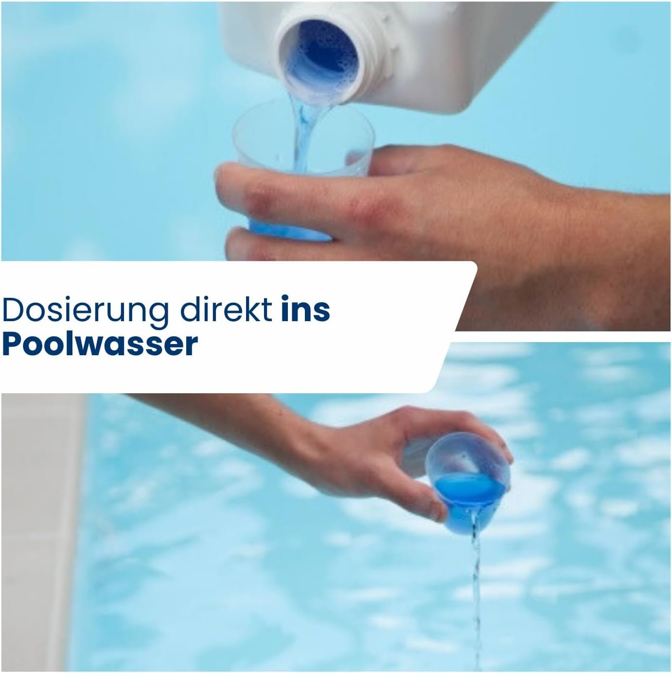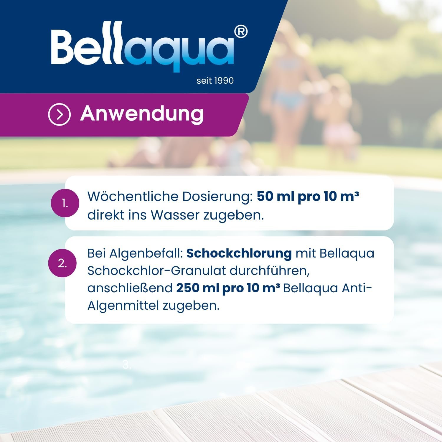 Einfache Anwendung: 50 ml pro 10 m³ Poolwasser bei laufender Umwälzpumpe direkt ins Wasser geben. Bei Algenbefall empfiehlt sich eine Stoßchlorung mit Bellaqua Stoßchlor-Granulat.