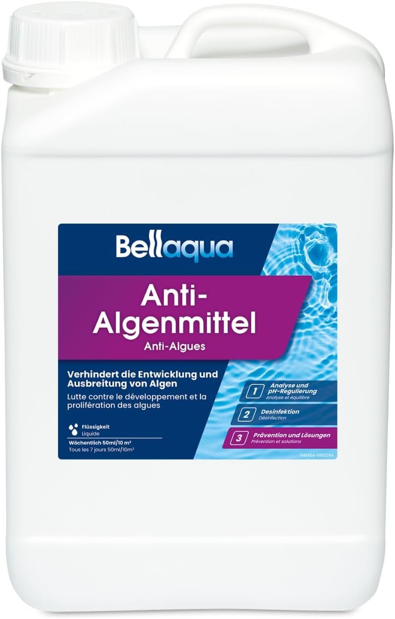 Stellen Sie den pH-Wert zwischen 7,0 und 7,4 ein. Wöchentliche Zugabe: 300 ml Algenmittel pro 10 m³ Wasser zugeben. Grünes oder trübes Wasser: Bellaqua Schoko-Chlorgranulat hinzufügen und dann 300 ml Anti-Algen-Mittel pro 10 m³ direkt ins Wasser dosieren. Für eine bessere Trübungsentfernung fügen Sie Bellaqua-Flockungsmittel (Sandfilter) oder Bellaqua-Klärmittel (alle Filtertypen) hinzu.