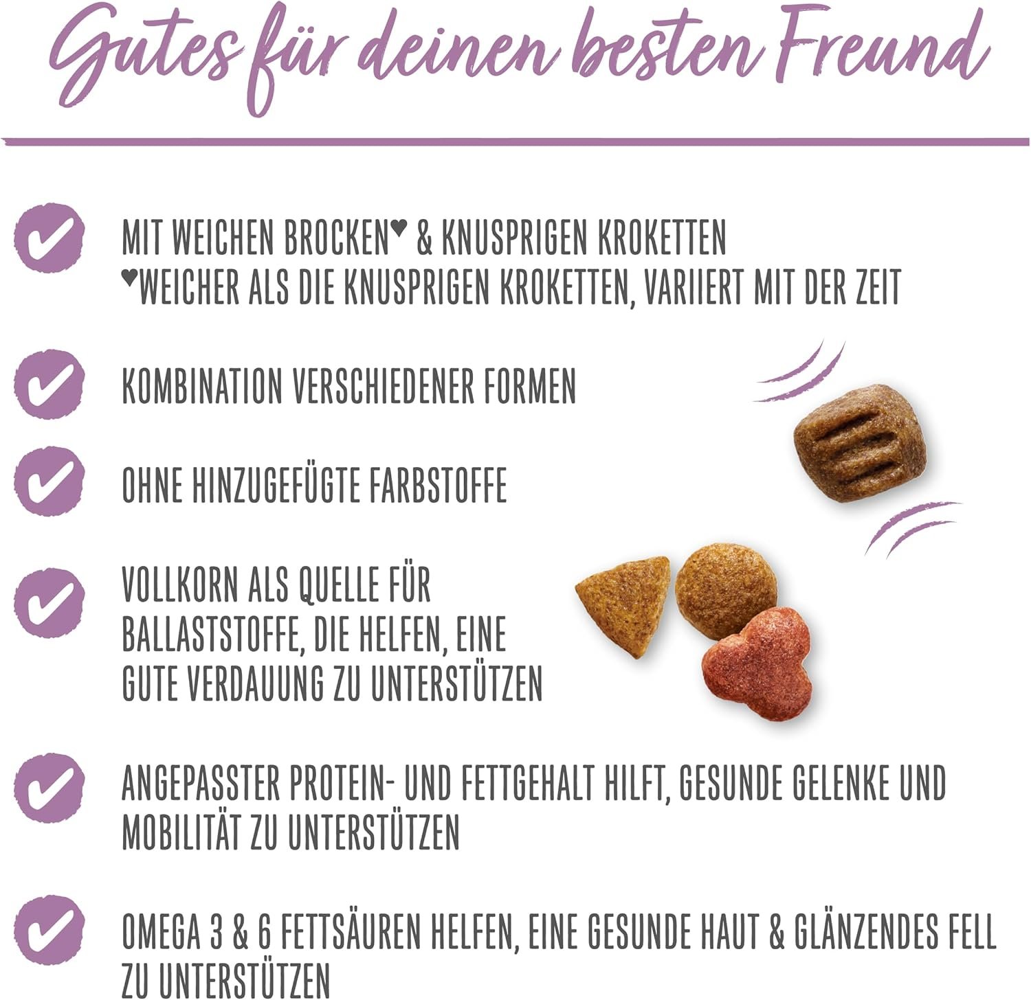 Eine sorgfältig ausgewogene Mahlzeit, die deinem Hund auch im Alter hilft, verspielt und aktiv zu bleiben mit einem Mix aus knusprigen Kroketten und weichen* Brocken für Geschmack & Textur, die dein Hund lieben wird. Mit den BENEFUL Mahlzeiten kannst Du Deinem Hund alles bieten – Geschmack, gesunde Ernährung und Freude!