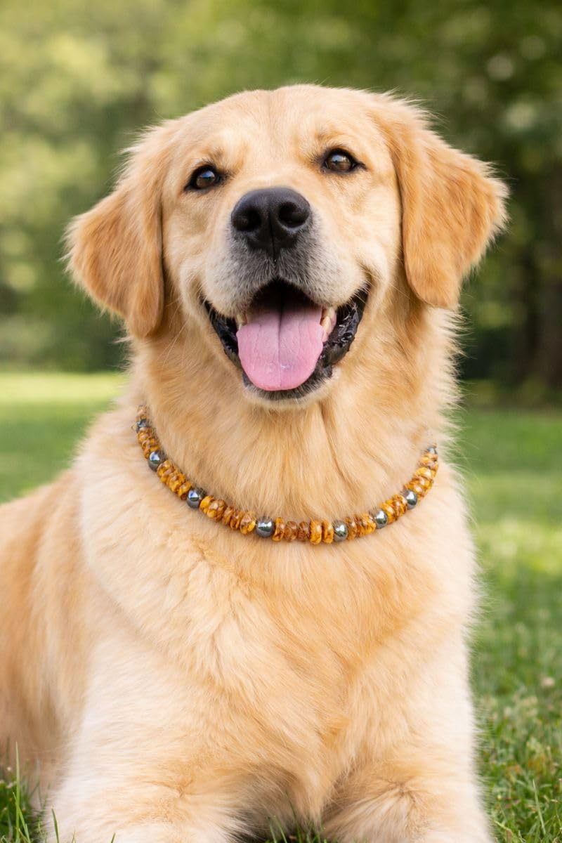 STILVOLL UND FUNKTIONAL Verleihen Sie Ihrem Haustier mit unserem eleganten Bernsteinhalsband einen edlen Look und schützen Sie es gleichzeitig vor unerwünschten Eindringlingen.