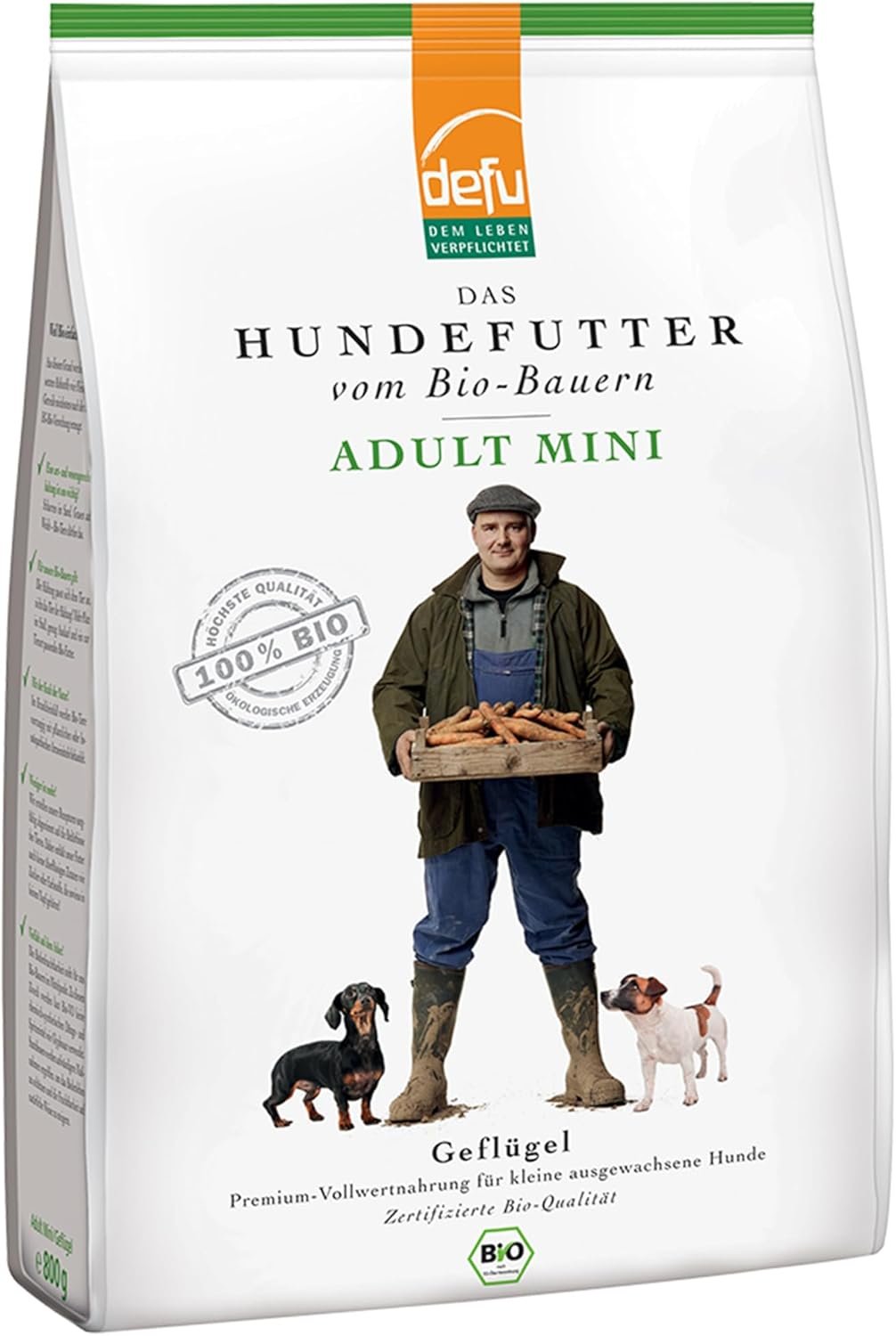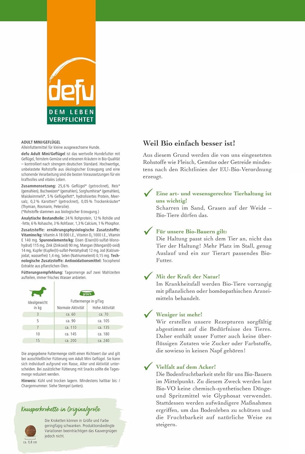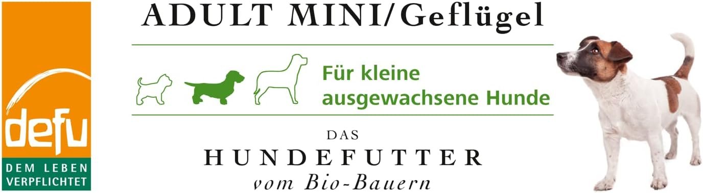Bio-Premium-Vollwertnahrung. Alleinfuttermittel mit reinem Bio-Geflügelfleisch aus artgerechter Tierhaltung. Glutenfreie Formel. Extra kleine Kroketten für kleine, erwachsene Hunde.