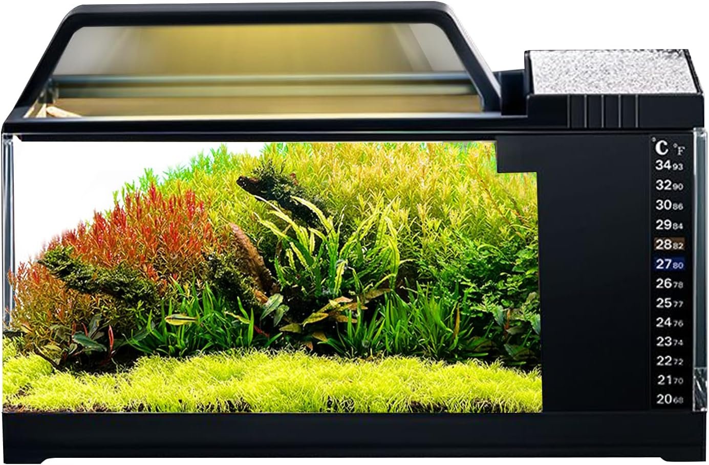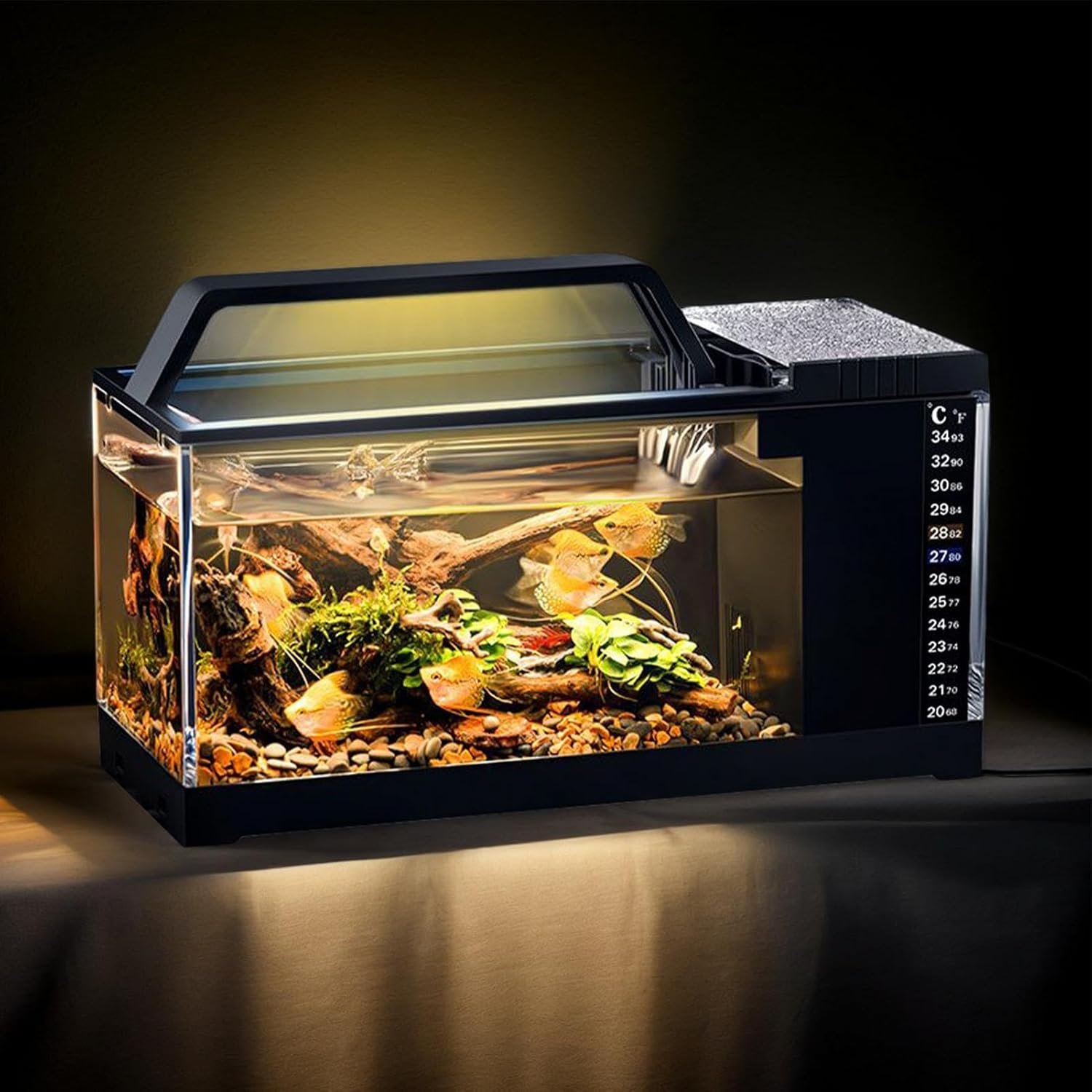 Merkmale: Effiziente Filterung, Nachahmung der Öko-Filtration, mit Temperaturüberwachung, Echtzeitbeobachtung der Aquariumtemperatur, simulierter Damm, der eine Torfreigabelandschaft schafft, LED-Beleuchtung schafft eine bezaubernde Atmosphäre für Ihre Fische.