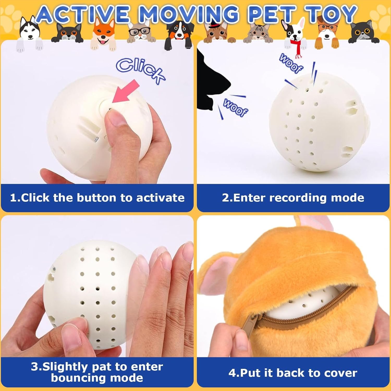 Einfach zu installieren und waschbar: Das bewegliche Hundespielzeug ist einfach zu installieren. Der niedliche Plüschbezug ist waschbar. Öffnen Sie einfach den Klettverschluss des Plüschbezugs, nehmen Sie den Sprungball heraus, reinigen Sie den Plüschbezug und lassen Sie ihn trocknen.