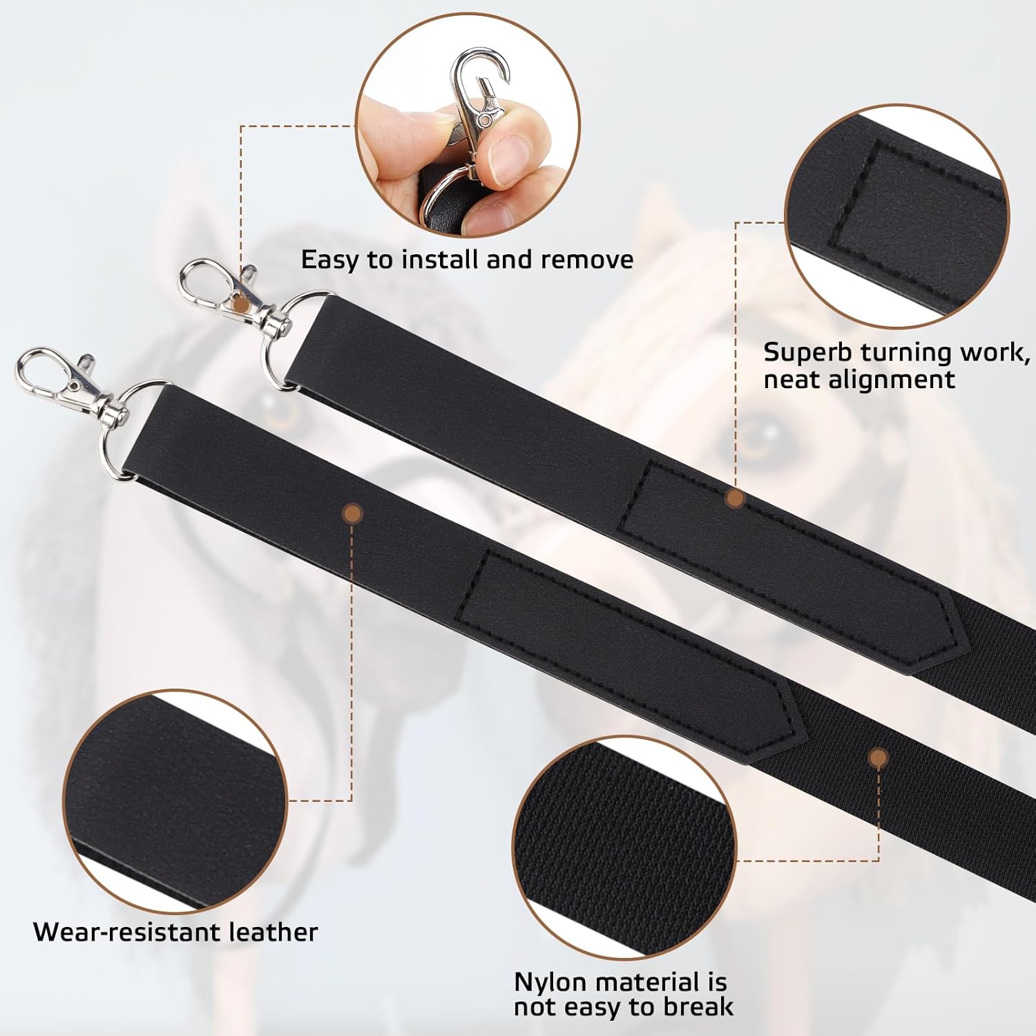 Einfach zu bedienen: Das Hobby Horse-Halfter hat eine Metallschnalle zur einfachen Befestigung, handgefertigt. Praktisches Zaumzeug für Pferde, einfach an Zaumzeug und Halfter anzubringen und zu entfernen. Das Hobbypferd-Zubehörset ist ein ideales und hilfreiches Zubehör für Ihr Pferd.