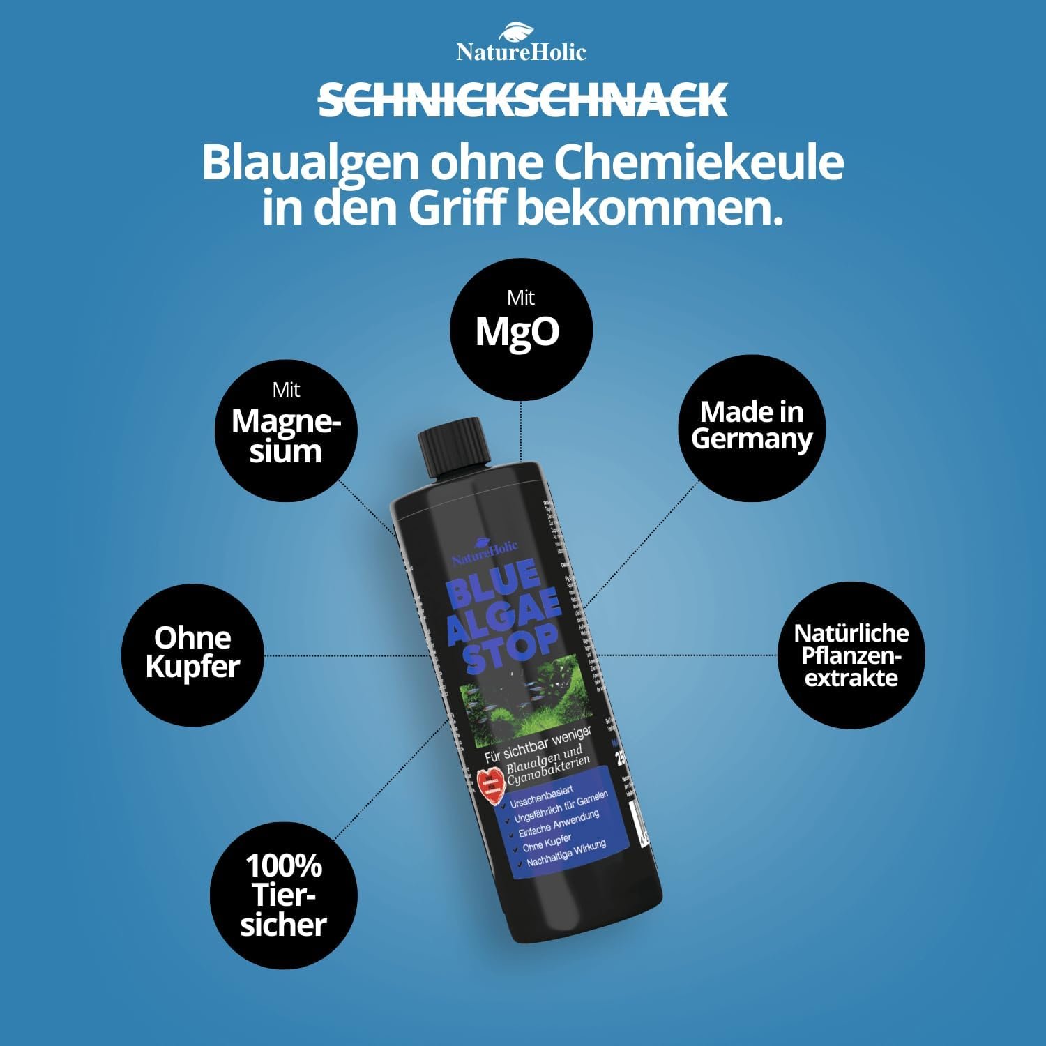 Natürliche Algenbekämpfung: Blue Algae Stop bekämpft auf natürliche Weise Blaualgen und andere Algenarten, indem es Nährstoff- und Bakterienungleichgewichte im Aquarium ausgleicht. Diese umweltfreundliche Methode verhindert Algenwachstum, ohne die Wasserchemie negativ zu beeinflussen.