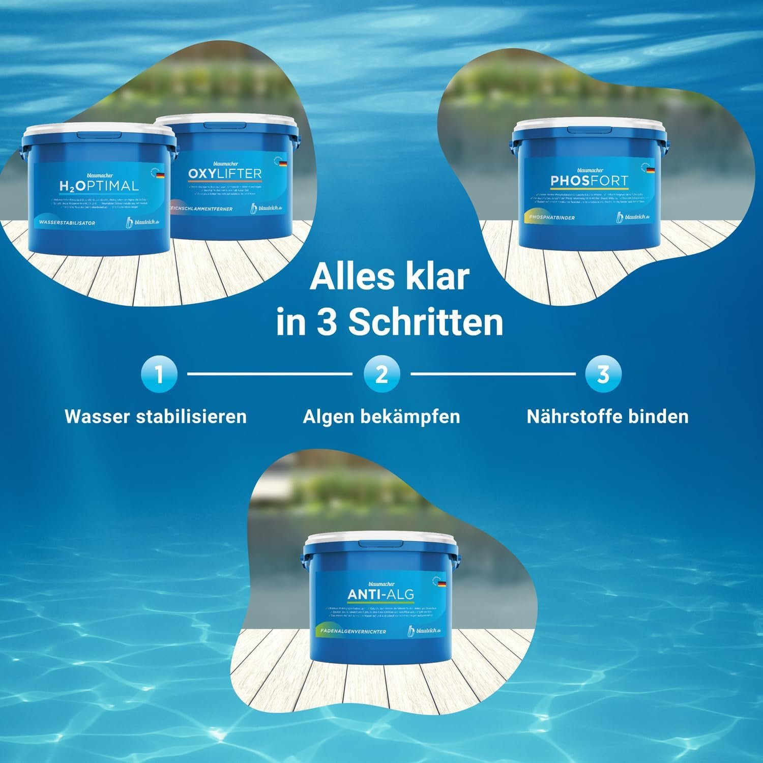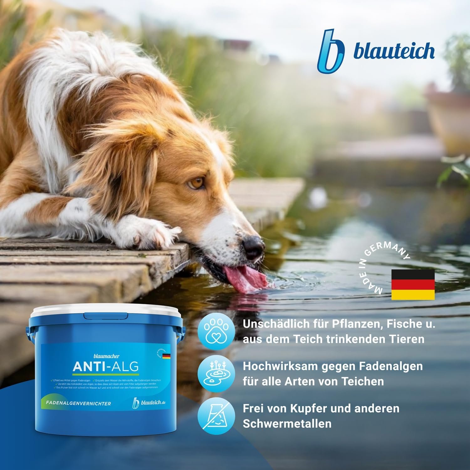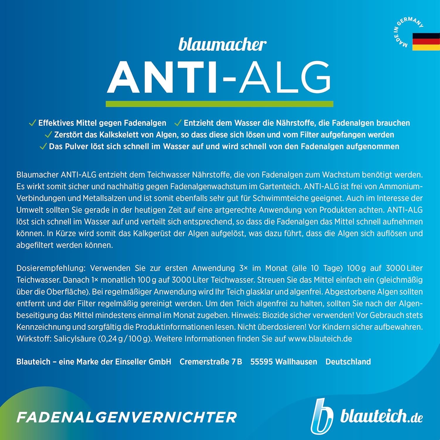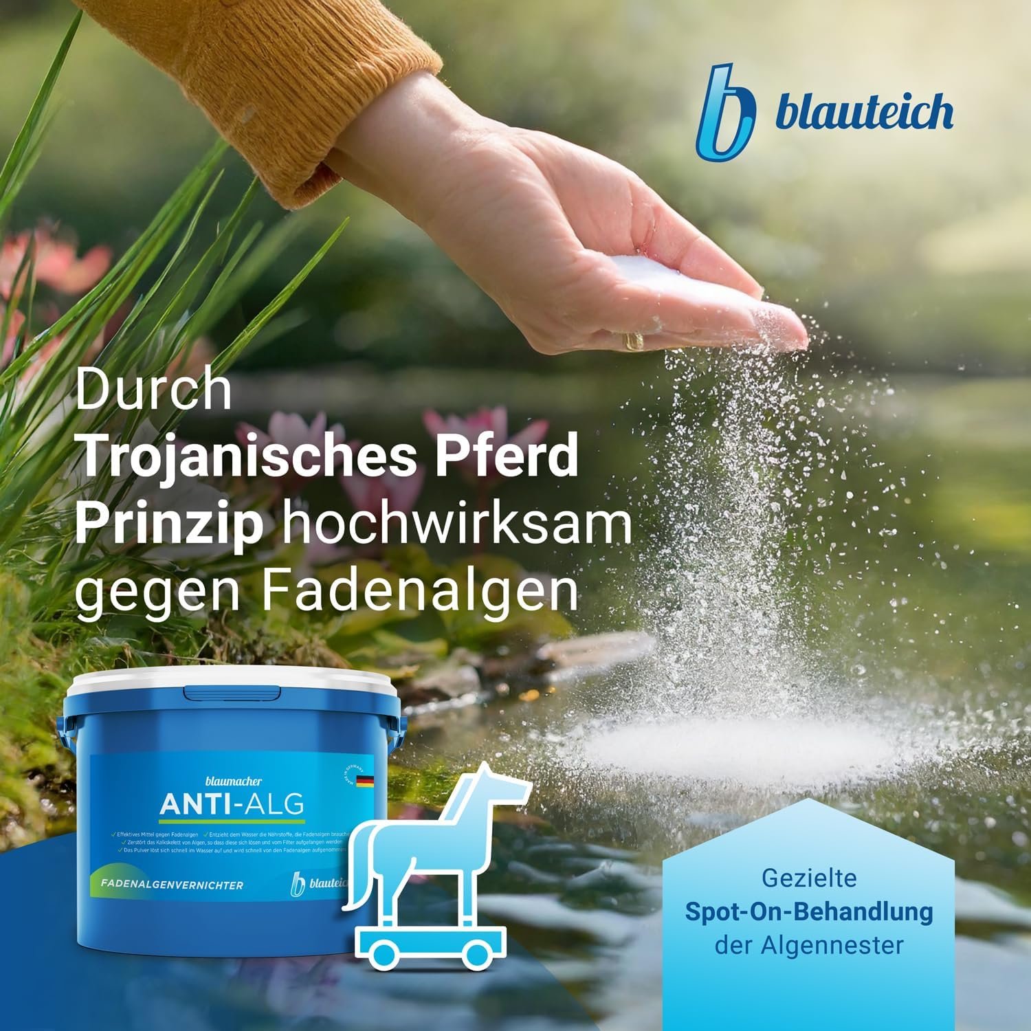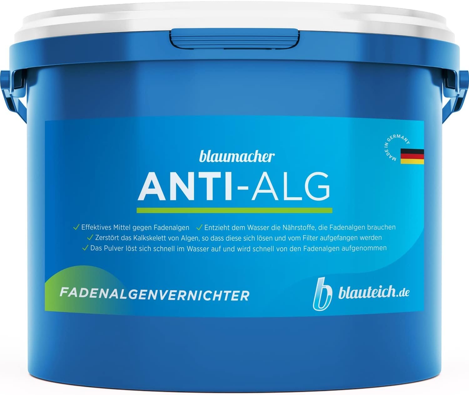 Schnelle Vernichtung hartnäckiger Fadenalgen durch unser schadstofffreies Algizit Blaumacher Anti-Algenmittel „Made in Germany“