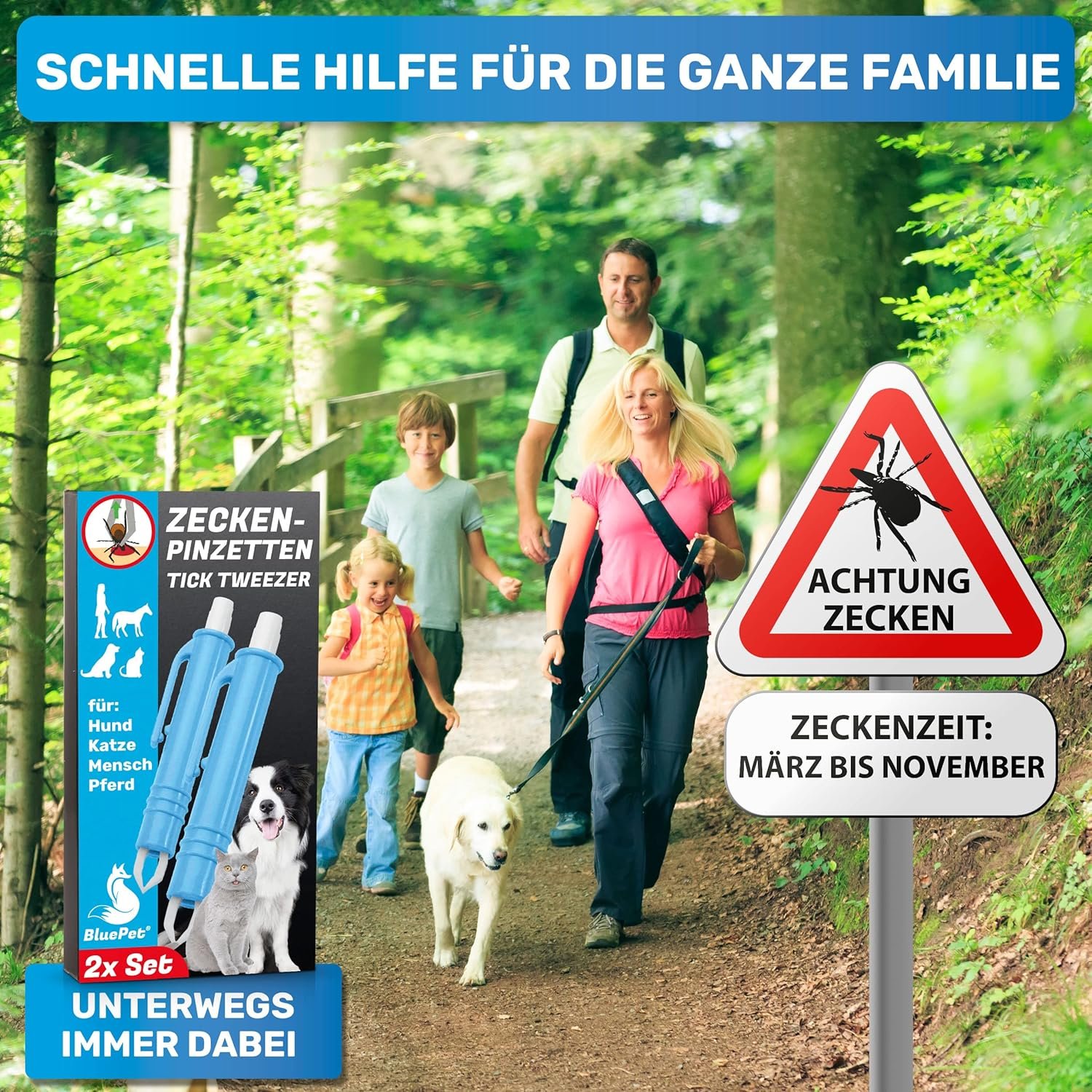 Mit Zeckenhaken, Zeckenpinzette, Zeckenpinzette und Zeckenkarte.