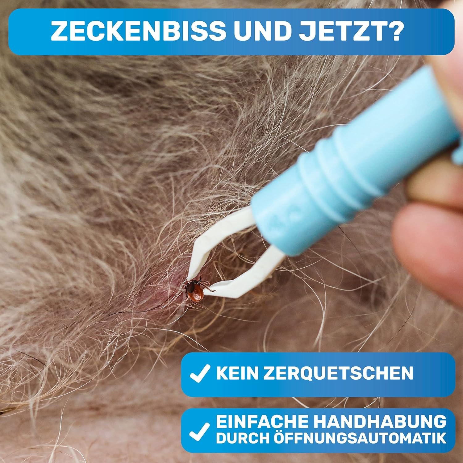 Besonders einfach: Führen Sie die geöffnete Zange über die Zecke, sodass sich die Spitzen unter dem Kopf der Zecke schließen. Mit etwas Geduld und leichtem Ziehen wartet man, bis die Beißwerkzeuge ermüden und die Zecke aus der Wunde gezogen wird.