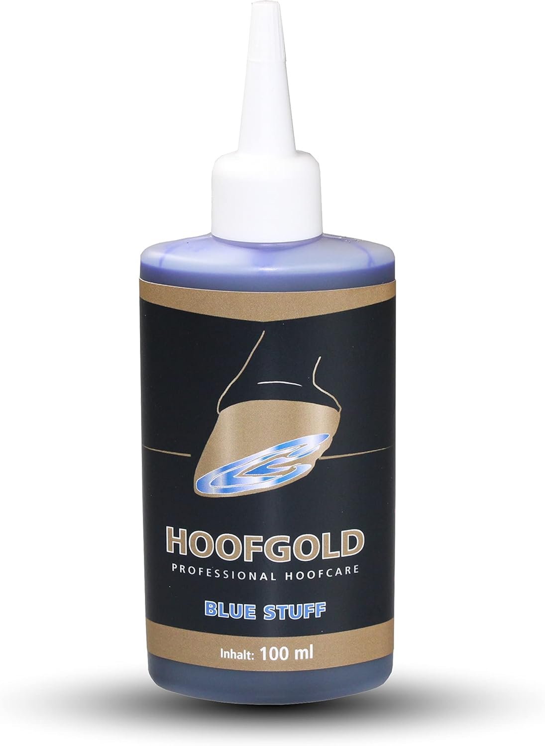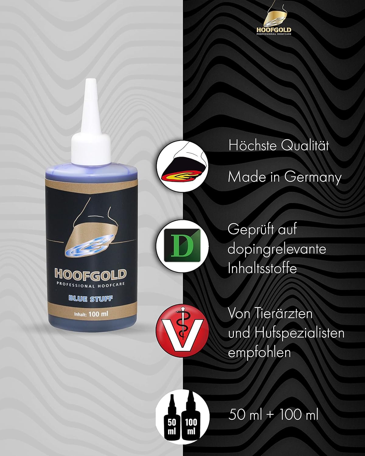 Schnelle Hilfe bei Jetfäule und White-Line-Krankheit: HOOFGOLD BlueStuff bekämpft wirksam Fäulnisbakterien und Pilze, die für übelriechende, weiche Hufe verantwortlich sind. Ideal für feuchte Bettwäsche und schlammige Böden.