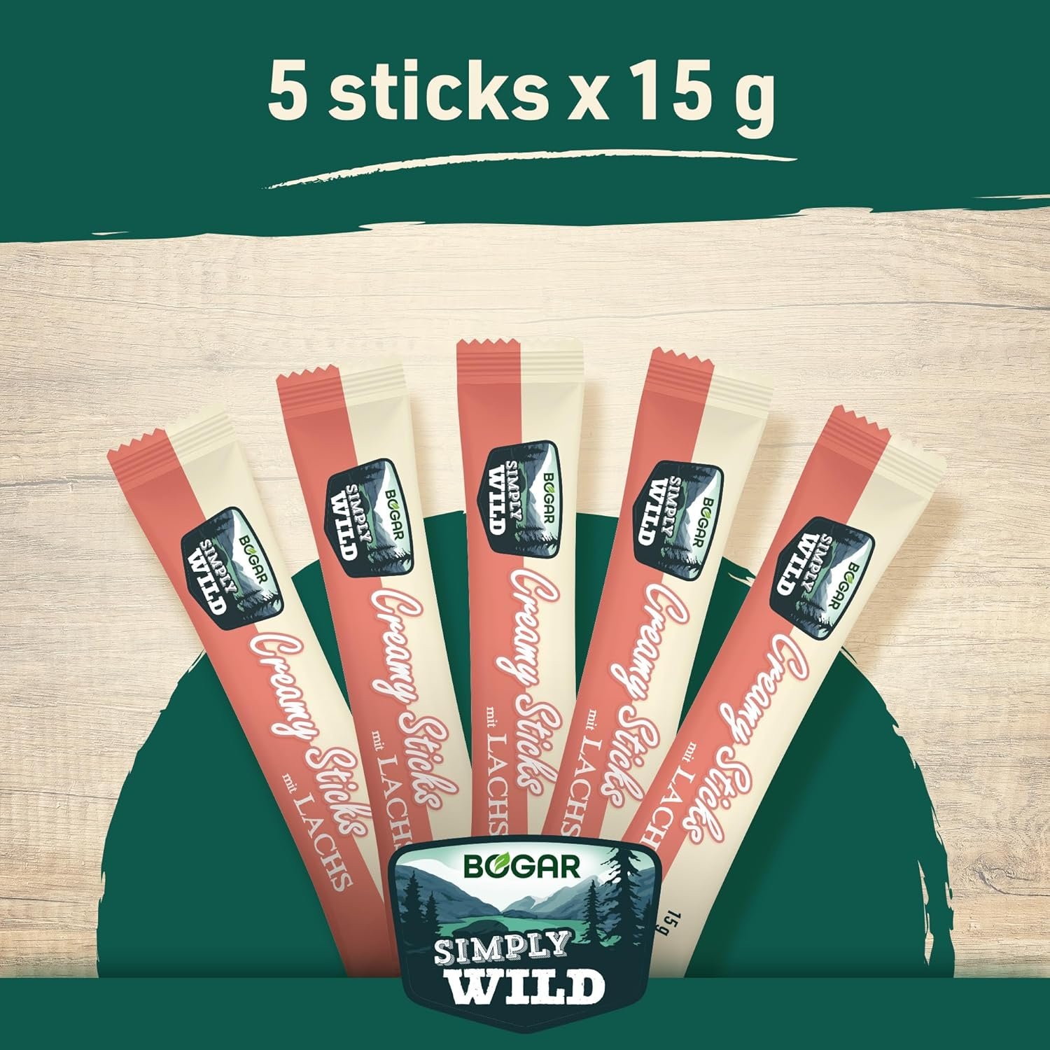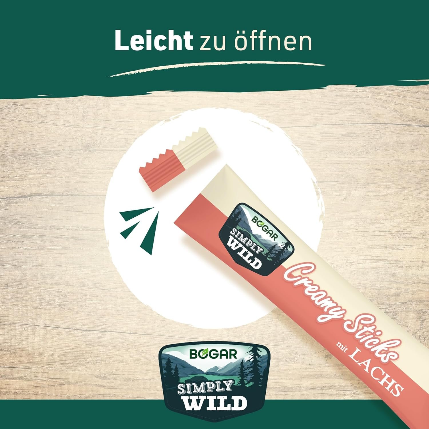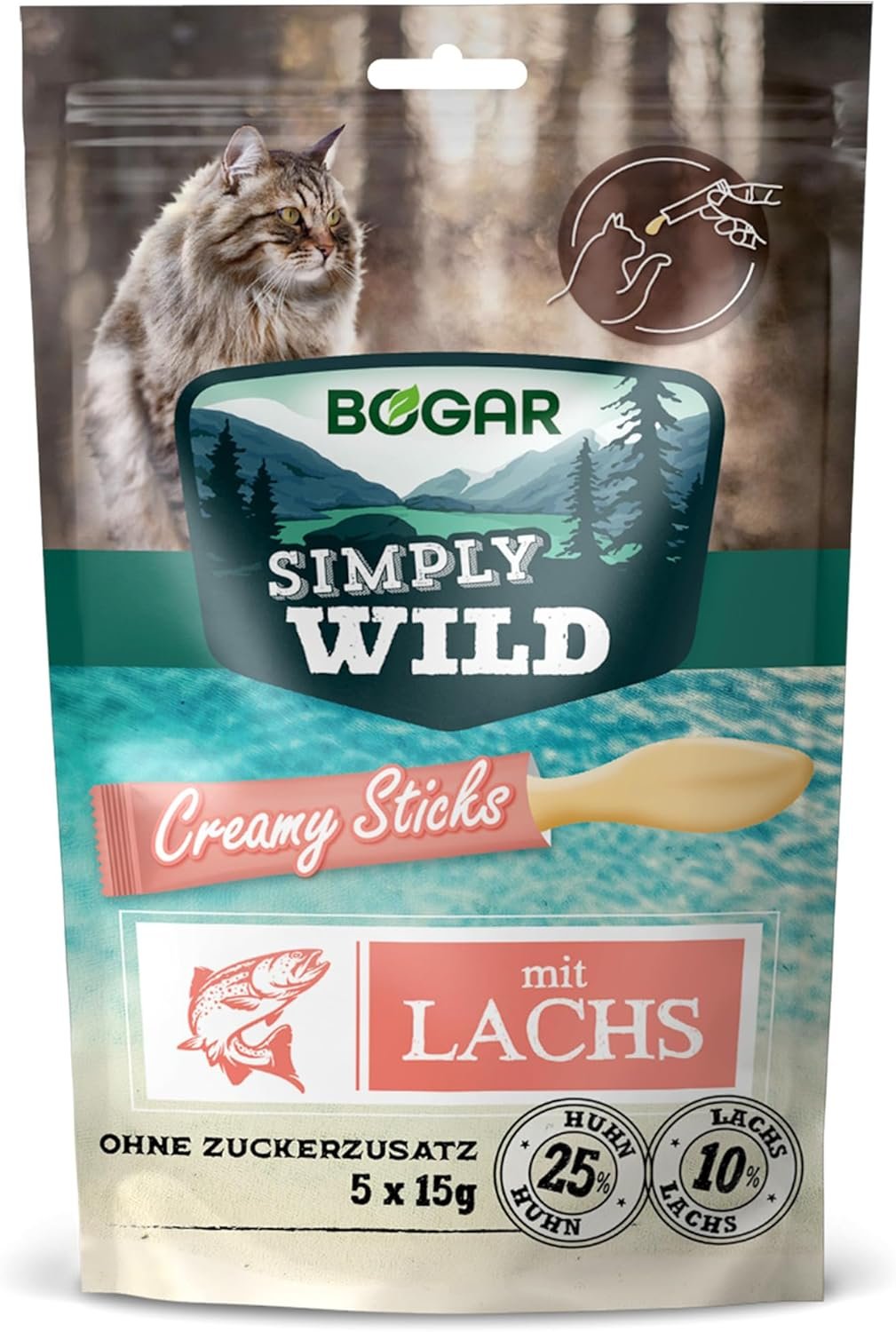 Katzensnacks mit Lachs: Simply Wild von Bogar bietet cremige Katzensnacks mit leckerem Lachs. Diese leckeren Katzensticks sind ideal für Katzen jeder Größe und fördern als Ergänzung zum Katzenfutter eine gesunde Ernährung.