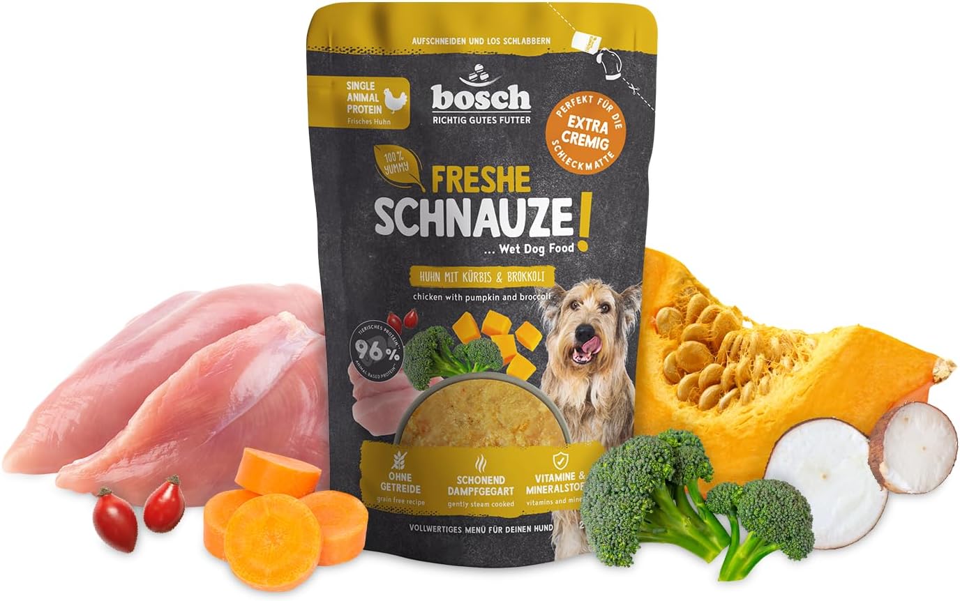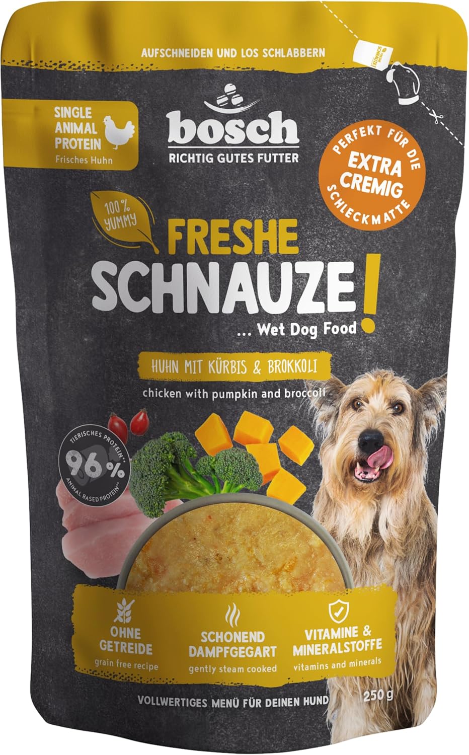 Vom Australian Shepherd bis zum Zwergschnauzer, vom Schlappohr bis zum Schlitzohr, von hart bis langhaarig, von Couch Potato bis Flash Beep – das exklusive Freshe Schnauzen-Nassfutter von Bosch Tiernahrung ist für ausgewachsene Hunde aller Größen, Rassen und Fellfarben geeignet. Denn Ihr Hund hat jeden Tag wirklich gutes Futter aus Baden-Württemberg verdient.
