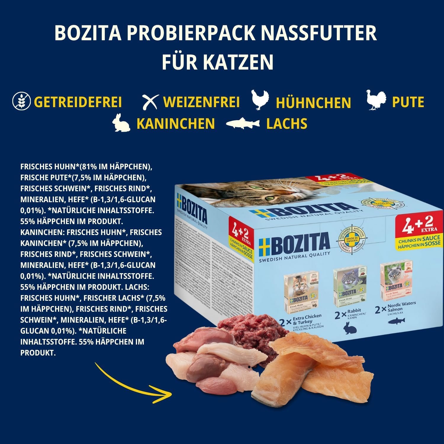 Bozita Probierpaket Nassfutter für Katzen 4+2 Tetra Mix Pack Vorspeisen in Soße 6 x 370 g – ohne Getreide, ohne Zucker, ohne Farbstoffe – 2 x viel Huhn & Truthahn, Kaninchen, Lachs