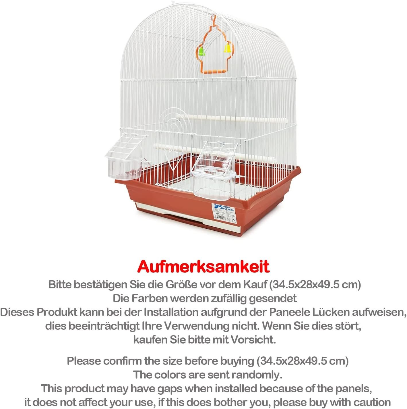 Käfig mit einer Größe von 34,5 x 28 x 49,5 cm. Der Käfig bietet ausreichend Platz für Ihren Vogel. Bitte bestätigen Sie die Größe vor dem Kauf, die Farbe wird zufällig ausgewählt, der Käfig ist nicht groß, er wird zum Tragen von Vögeln und für Spaziergänge im Freien verwendet.