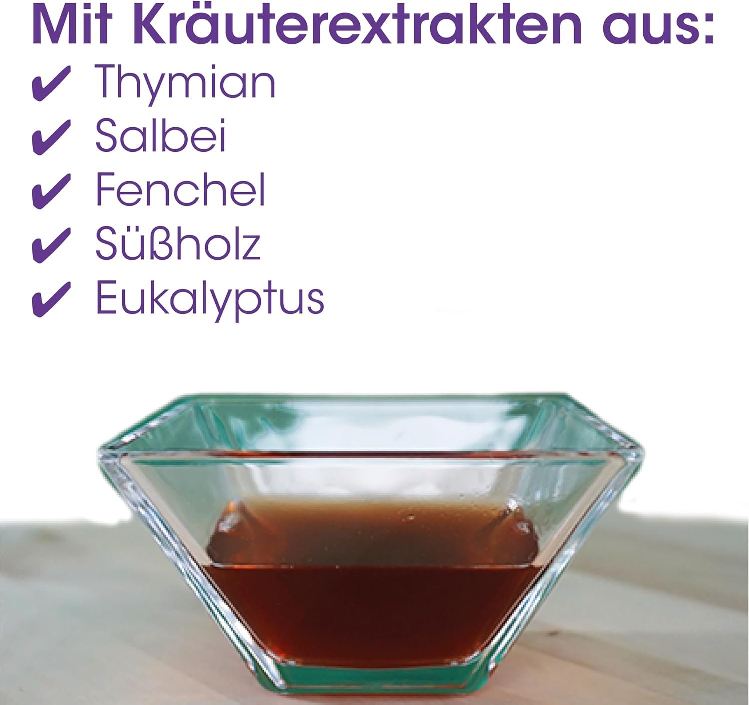 Enthält rein natürliche Kräuterextrakte aus Thymian, Salbei, Fenchel, Süßholz und Eukalyptus