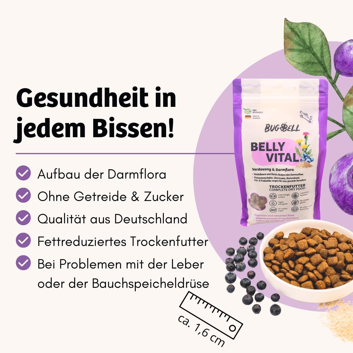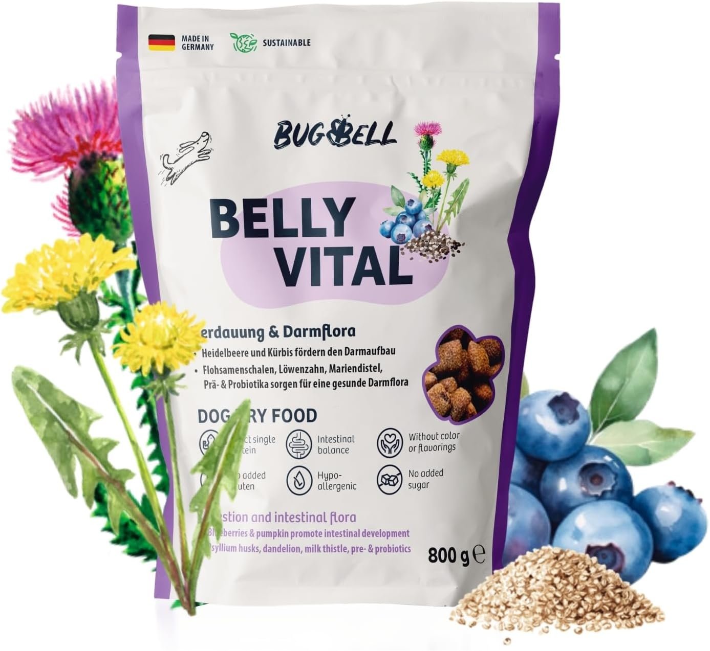 🐶 BellyVital: Speziell für Hunde mit empfindlichem Magen entwickelt, angereichert mit Blaubeeren, Flohsamenschalen sowie Prä- und Probiotika zur Förderung der Verdauung und Darmgesundheit.