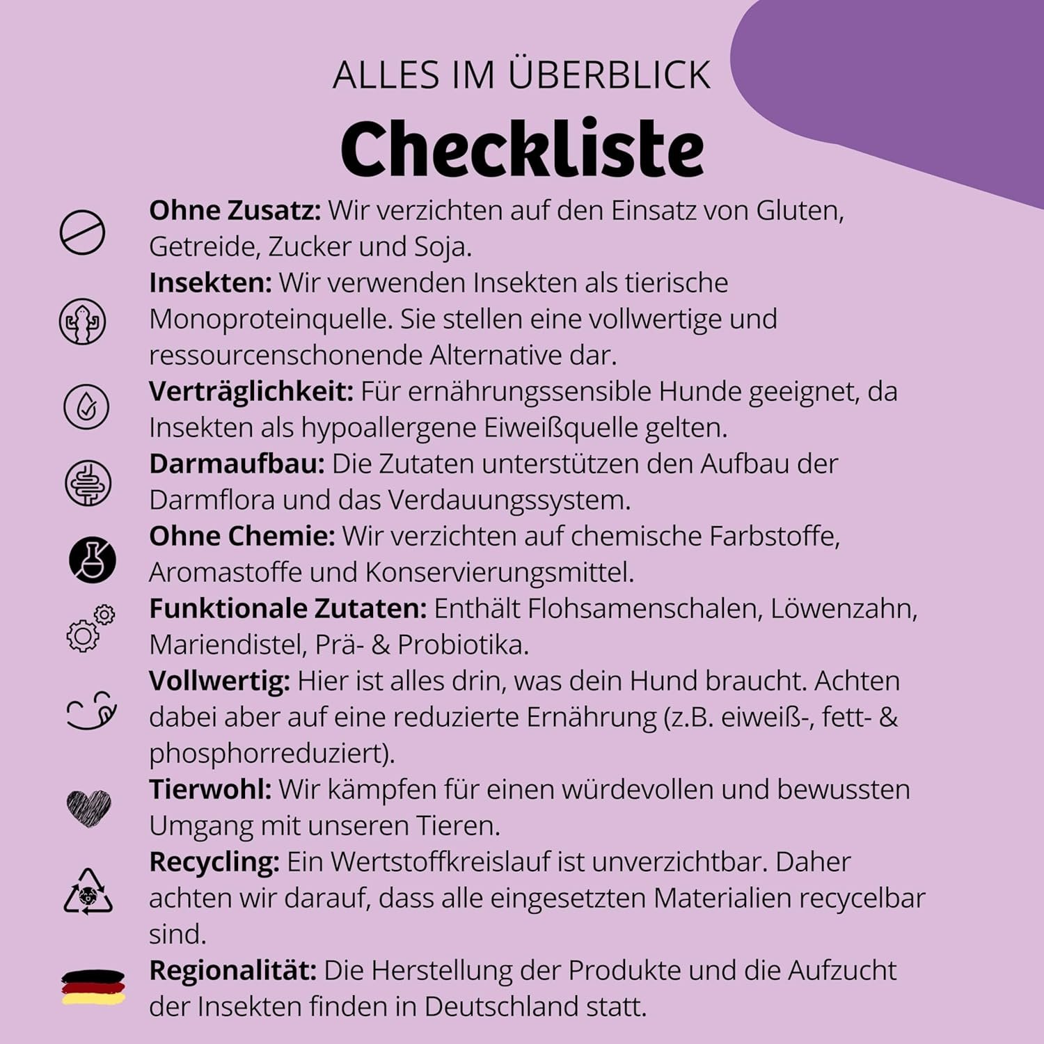 Monoproteinquelle aus Insekten: Verwendet Insektenmehl als hochverdauliche und umweltfreundliche Proteinquelle, ideal für ernährungssensible Hunde.