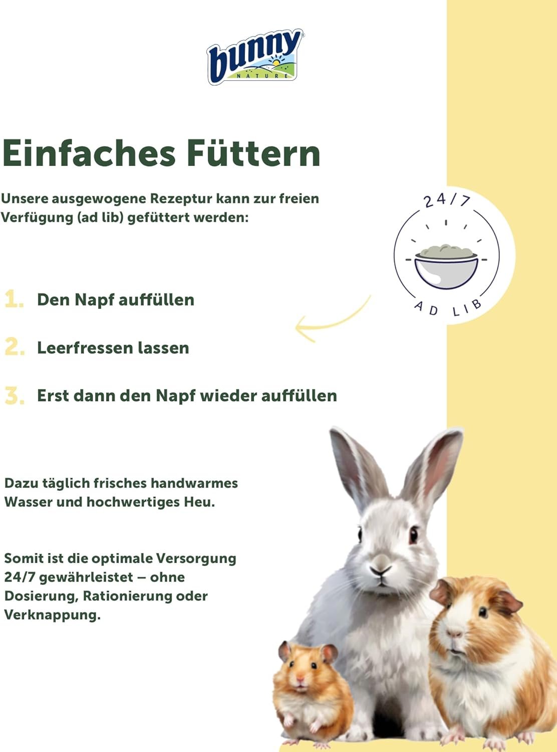 Das Futter steht Ihnen zur freien Verfügung: Napf komplett füllen, entleeren lassen und erst dann wieder auffüllen, immer ergänzt durch frisches, warmes Wasser und hochwertiges Hasenheu.