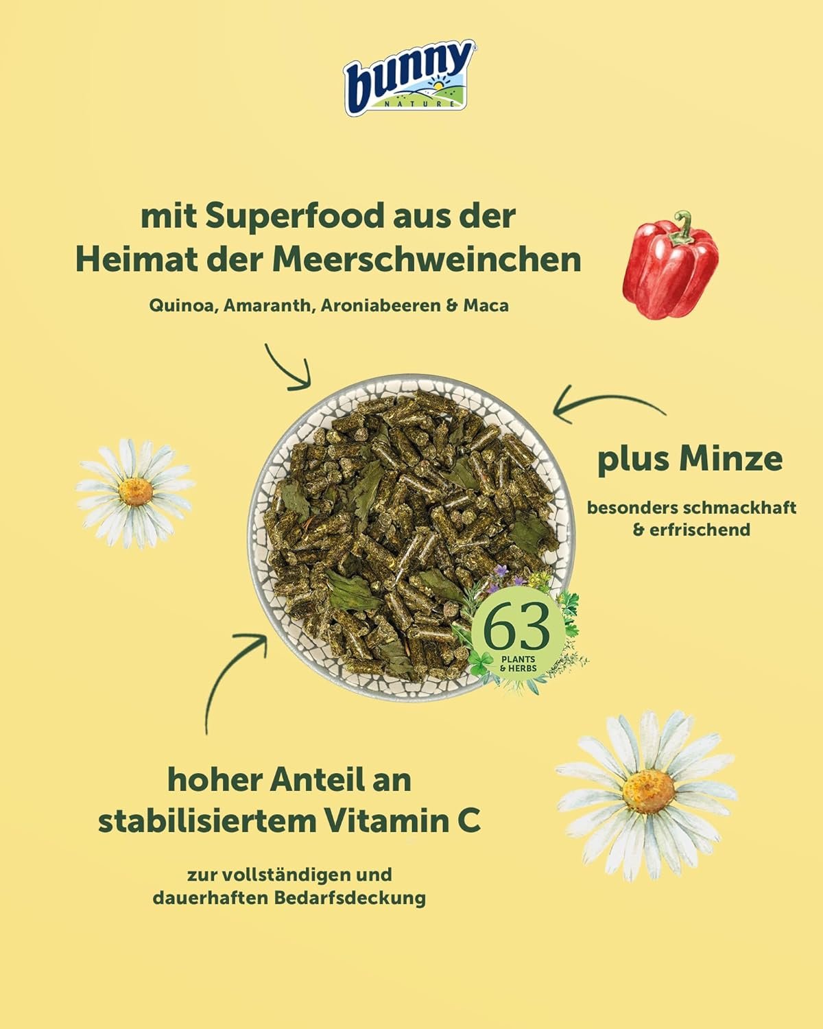 Genießen Sie Superfoods auf natürliche Weise: Bieten Sie Ihrem Meerschweinchen eine ausgewogene Ernährung, angereichert mit Superfoods wie Quinoa und Aroniabeeren, ohne künstliche Zusatz- und Konservierungsstoffe.