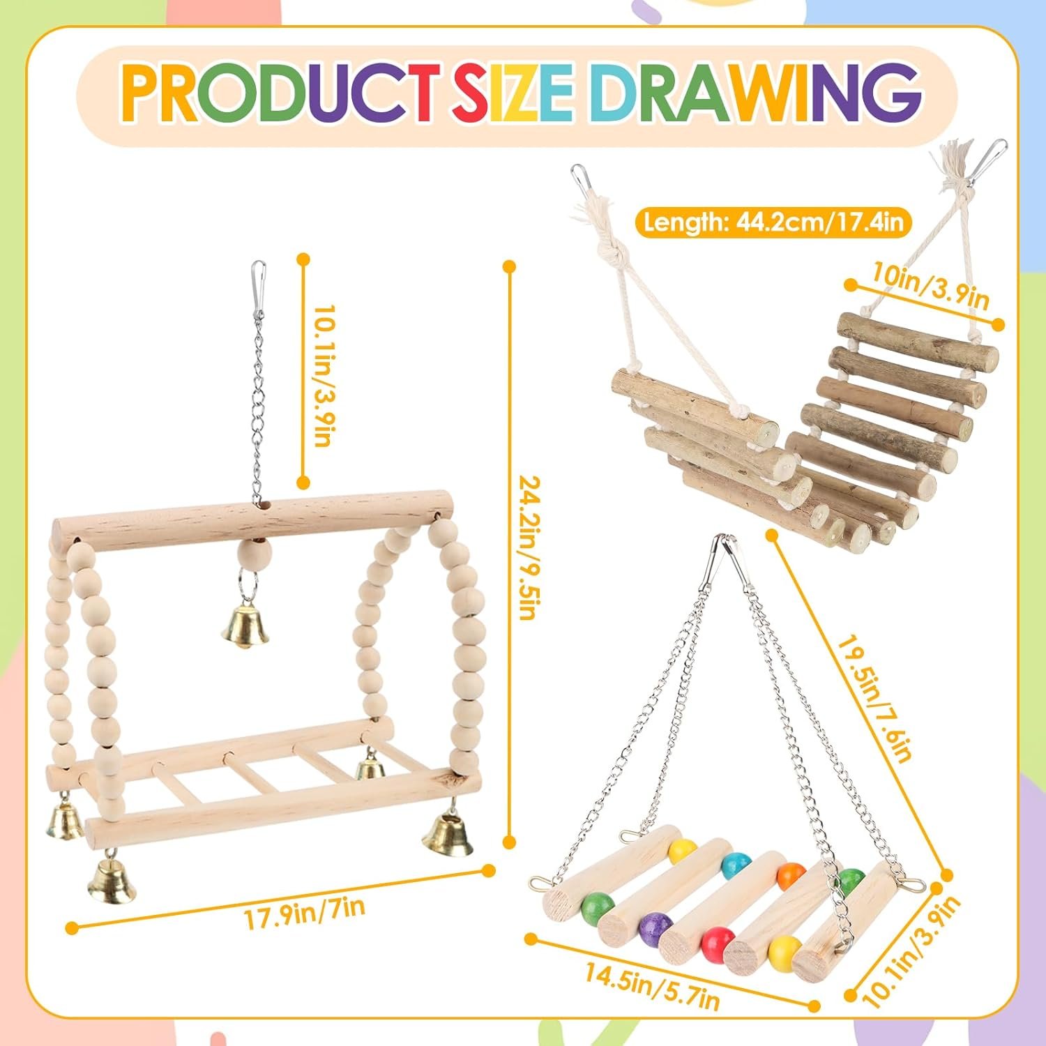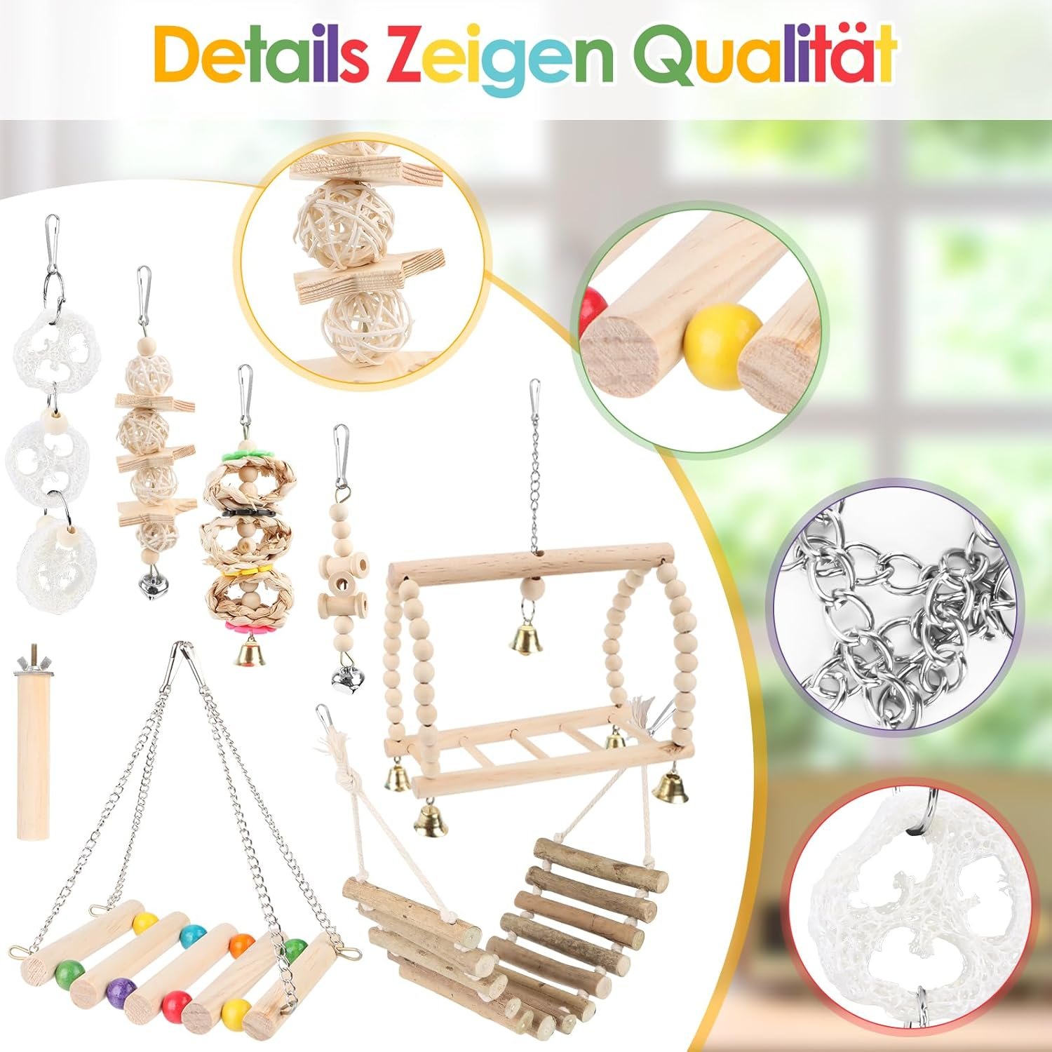 Abwechslungsreiches Holzspielzeug für Vögel: Das Produkt umfasst 8 verschiedene Arten von Vogelspielzeugen, unterteilt in mehrere Szenenebenen, mit verschiedenen Spielmöglichkeiten, Sitzstangen, Ketten, Glocken, Hängematten usw., die Ihrem geliebten Vogel den idealen Ort für Aktivitäten in der Luft, zum Kauen und Klettern bieten.