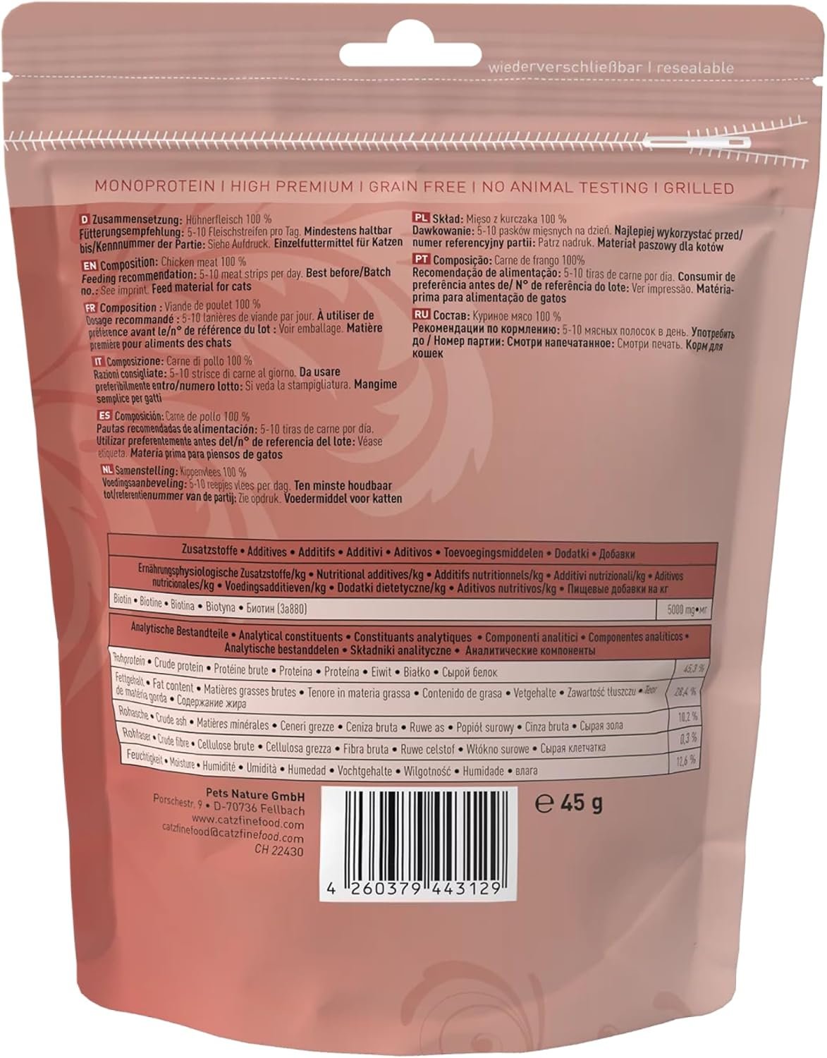 Futtergesundheit: 100 % Hühnerfleisch, ideal für empfindliche Katzen mit Unverträglichkeiten. Ohne Zucker, Getreide, Farb- oder Konservierungsstoffe. Empfehlung: 5-10 Streifen pro Tag