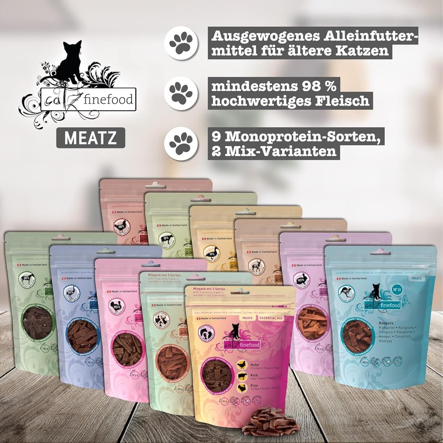 Zum Warenkorb hinzufügen Zum Warenkorb hinzufügen Zum Warenkorb hinzufügen Zum Warenkorb hinzufügen Kundenrezensionen 4,4 von 5 Sternen 1.337 4,3 von 5 Sternen 560 4,4 von 5 Sternen 238 4,5 von 5 Sternen 2.166 4,2 von 5 Sternen 254 4,6 von 5 Sternen 126 Preis – keine Daten – keine Daten 23,84 €23,84 € 2,84 €2,84 € 17,29 € 17,29 € 33,33 € 33,33 € Empfehlung Getreidefreies Alleinfuttermittel mit viel frischem Fleisch, Fisch, Meeresfrüchten, Innereien und Kochsud, ergänzt mit erlesenen Zusatzstoffen wie Ölen, Gemüse, Obst und Kräutern. Besonders bekömmliches Alleinfuttermittel für Katzen mit feiner Konsistenz. Mit Eierschalenmehl als natürlicher Calciumquelle für eine optimale Entwicklung der Kleinen. Getreidefreies Senioren-Alleinfuttermittel in gewohnter catz-finefood-Qualität, abgestimmt auf altersbedingte Bedürfnisse. Knusprige, schonend gegrillte und getrocknete Leckerlistreifen, getreidefrei und Monoprotein mit hohem Fleischanteil. Getreidefreies Monoprotein-Nassfutter mit über 98 % Fleisch, Innereien, Fisch und Kochsud, ergänzt mit Mineralien und hochwertigem Öl. Getreidefreies Alleinfuttermittel mit saftigen Stücken und naturbelassenem Fleisch, Innereien, Fisch, Meeresfrüchten in köstlicher Sauce. Hergestellt in Deutschland Deutschland Deutschland Schweiz Deutschland Deutschland Größen / Verpackung 85 g Beutel, 200/400/800 g Dosen 85 g Beutel, 200 g Dosen 85 g Beutel, 200 g Dosen 45 g Beutel 85 g Beutel, 200/400/800 g Dosen 200 g Dosen Erhältlich im Probierpaket ✓ ✓ ✓ ✓ ✓ ✓ ✓