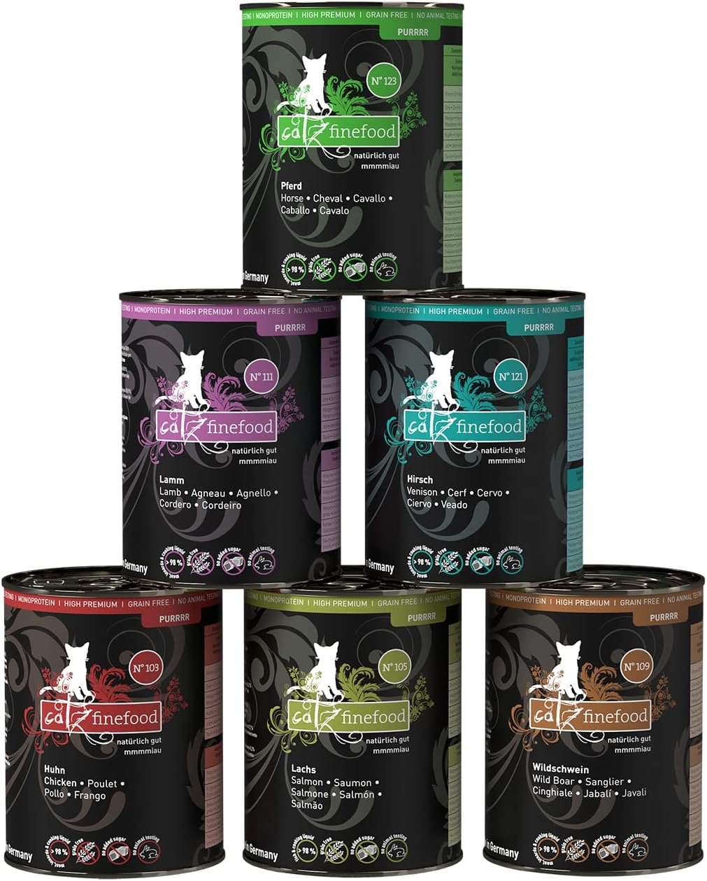 Inhalt: Das Monoprotein-Multipack besteht aus Huhn, Lachs, Wildschwein, Lamm, Hirsch und Pferd mit 70 % Fleischanteil. Garantiert ohne Konservierungsstoffe, Geschmacksverstärker oder Farbstoffe