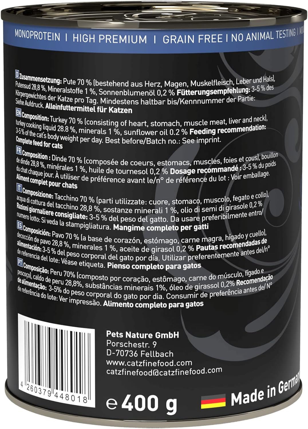 catz finefood Purrrr – ist ein sehr hochwertiges Monoprotein-Nassfutter für Katzen, abgestimmt von Ernährungsexperten und Tierärzten für ernährungsempfindliche oder von Unverträglichkeiten geplagte Katzen
