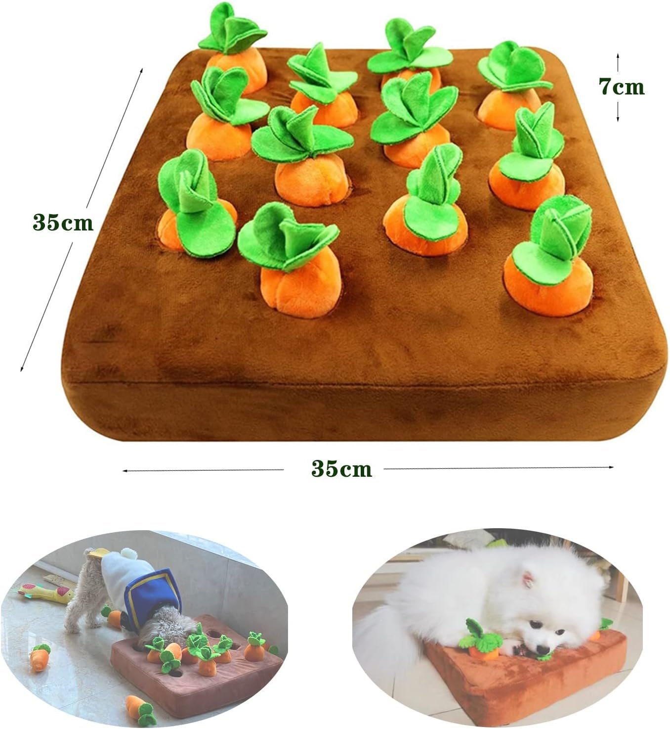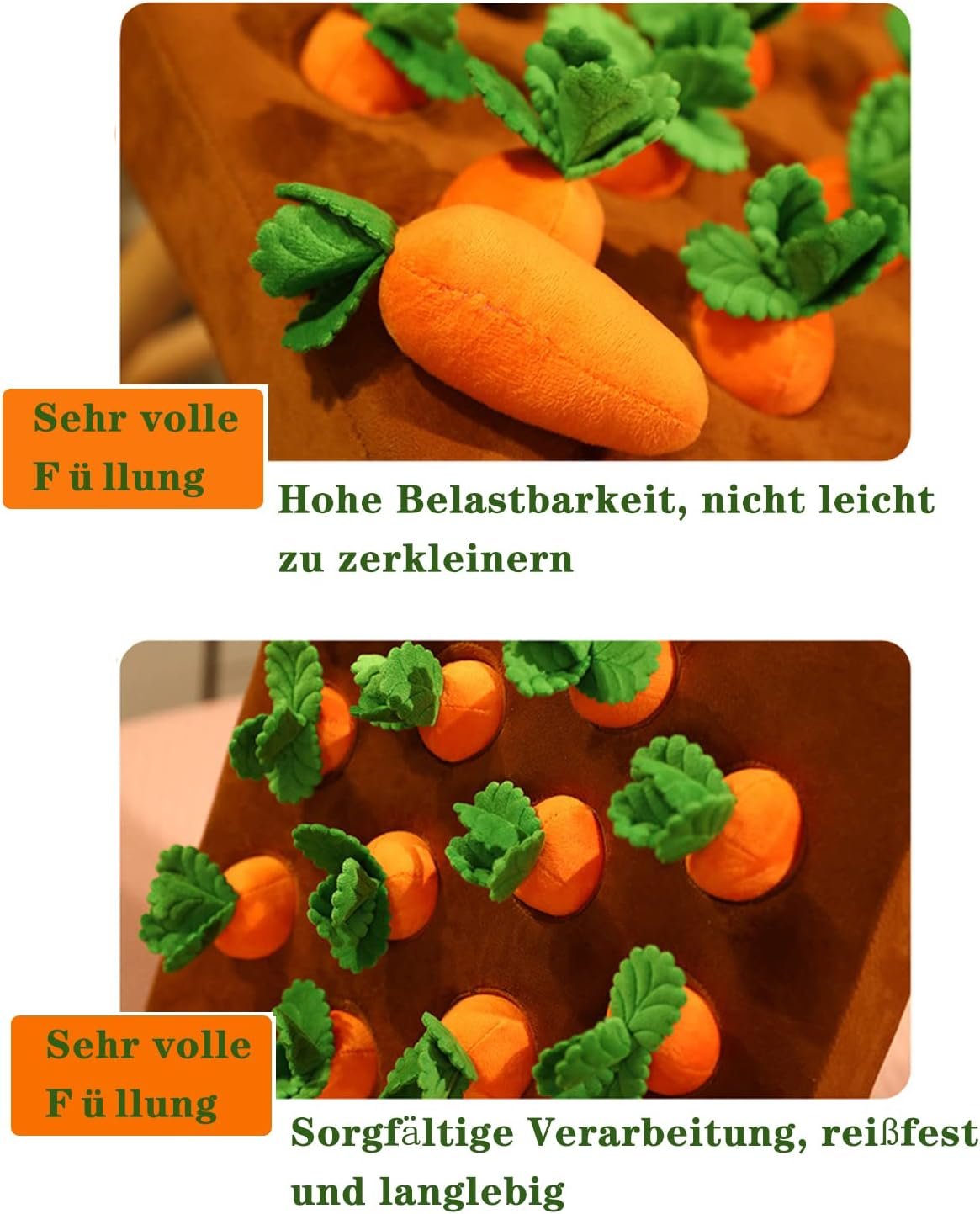 Das interaktive Hundespielzeug wurde in einer Vacloedes-Verpackung versendet, aber bitte machen Sie sich keine Sorgen, es dehnt sich gut im Wasser aus. Der Durchmesser des Karottenlochs (zum Verstecken von Snacks) beträgt 5 cm, die Tiefe 6 cm. Bitte überprüfen Sie die Größe für Ihren Hund.