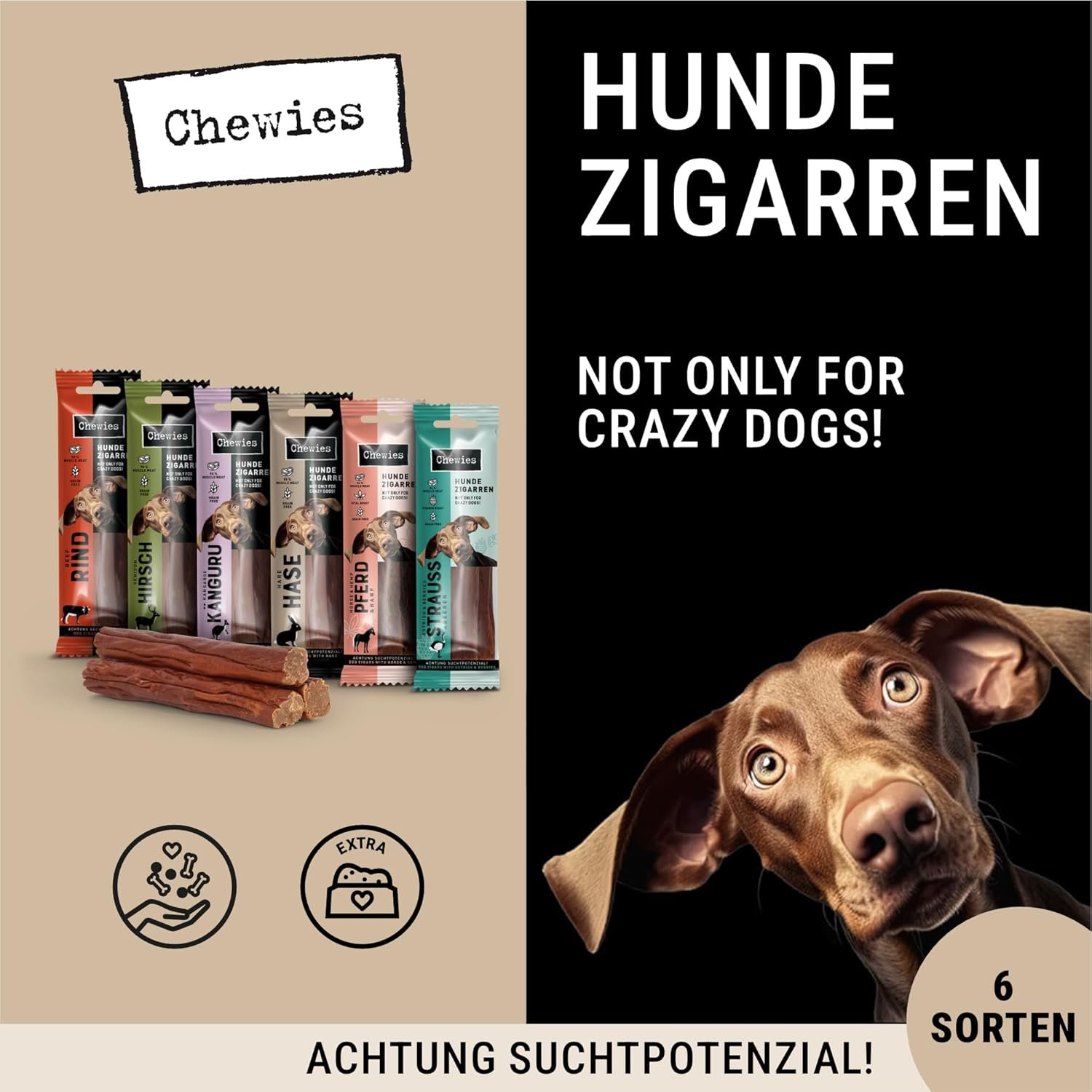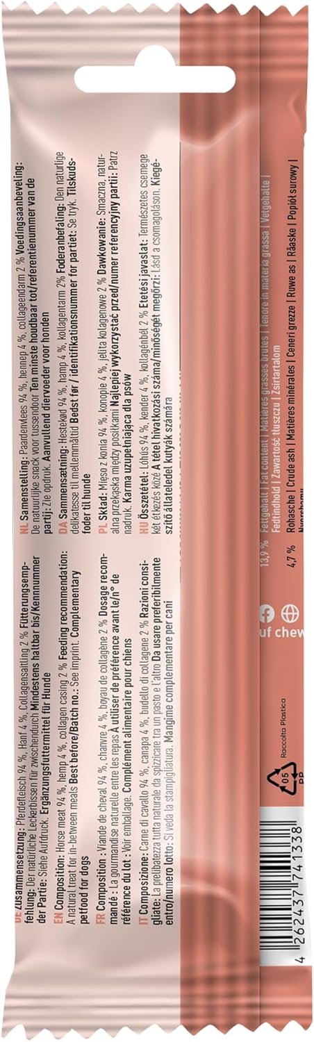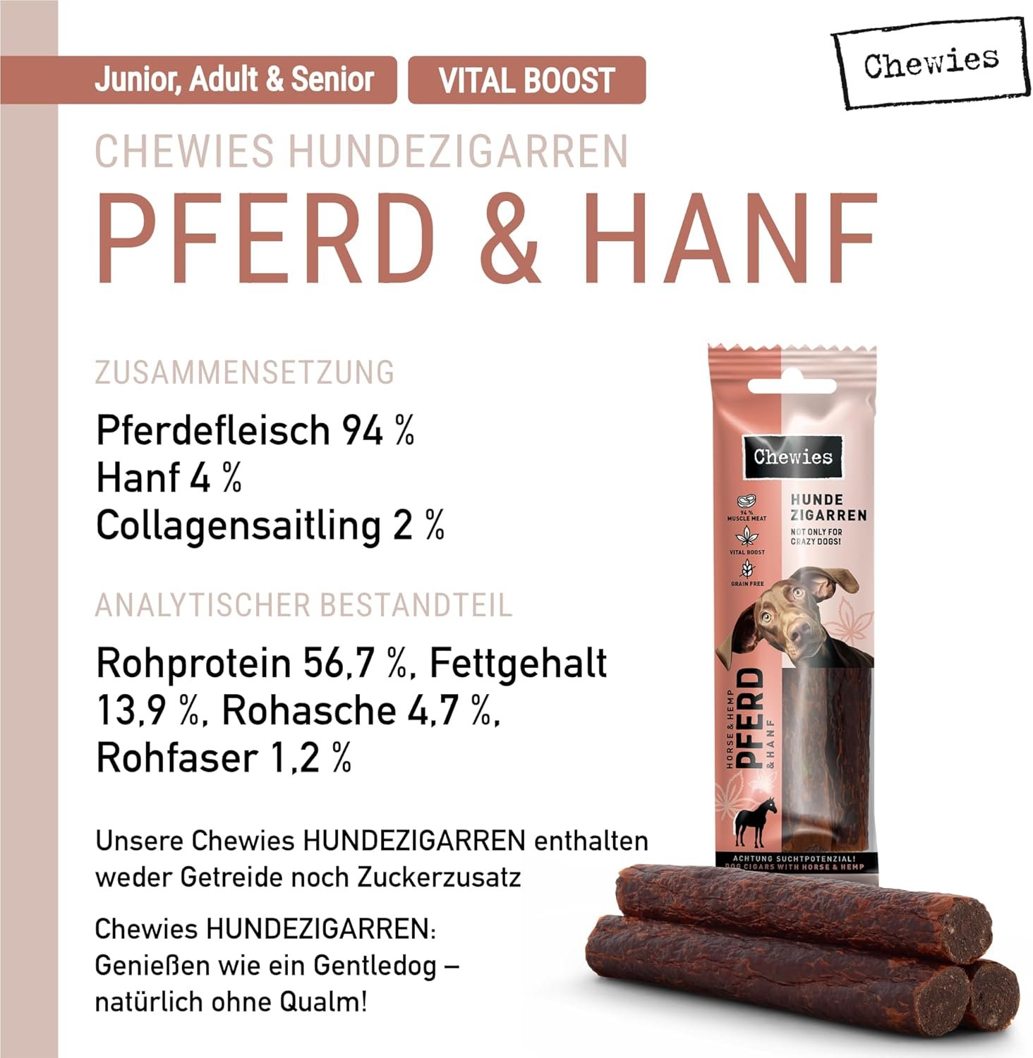 Chewies Dog Zigarre Strauß & Beeren 75 g. Chewies Hundezigarren: Genießen wie ein sanfter Hund – natürlich ohne Rauch! Ist Ihr Vierbeiner sehr streng zu Ihnen? Aufgeweckte Hunde wissen: Ein Lieblingssnack am Tag ist wohl das Mindeste. Der süßeste Blick hilft – mit falsch gelegtem Kopf! – oder alle erlernten Tricks gleichzeitig ausführen. Es ist schwer, verrückten Aktionen zu widerstehen, oder? Umso wichtiger ist es, hundefreundliche Snacks anzubieten. Chewies Hundezigarren sind garantiert rauchfrei und bescheren wahre Genussmomente. Unsere Hundezigarren sind durch ihre leicht zu schnappende Form so verführerisch. Und im Inneren begeistert voller, intensiver Fleischgeschmack. Der hohe Fleischanteil von 98 % verwöhnt auch anspruchsvollste Fellnasen mit feinstem Muskelfleisch. Die Sorten Rind, Kaninchen, Känguru und Hirsch warten auf Ihren Genießer. Die Hundezigarren punkten nicht nur im Geschmack, sondern auch mit hohem Proteingehalt. Sie sind zudem getreidefrei und ohne Zucker oder andere Zusatzstoffe. Wir verwöhnen unsere Vierbeiner gerne so bekömmlich. Bei den Sorten Pferd mit Hanf und Strauß mit Beeren beträgt der Fleischanteil 94 % reines Muskelfleisch. Für den zusätzlichen Nährstoffschub werden Superfoods hinzugefügt. Hanf ist reich an Ballaststoffen und eine natürliche Quelle für Aminosäuren, Magnesium, Eisen und Zink. Eine wahre Nährstoffbombe! Auch Himbeeren und Johannisbeeren sind ein echter Vitaminschub für Ihren Vierbeiner. Chewies Hundezigarren sind der perfekte Snack für echte Genießer. Und das Beste: Sie sind nicht nur für Welpen ab 18 Jahren erlaubt, sondern erfreuen aufgrund der angenehmen Textur auch graue Schnauzen. Bei euch knabbert jeder mit, der das Leben genießen möchte! Wie sorgt der perfekte Hunde-Zigarren-Genussmoment für Ihre Fellnase? Lässig cool oder Gentleman-like? Ganz gleich, wie Ihr Hund es genießt, für jeden: Hundezigarren sind purer Genuss. Kausnacks – NICHT NUR FÜR VERRÜCKTE HUNDE!