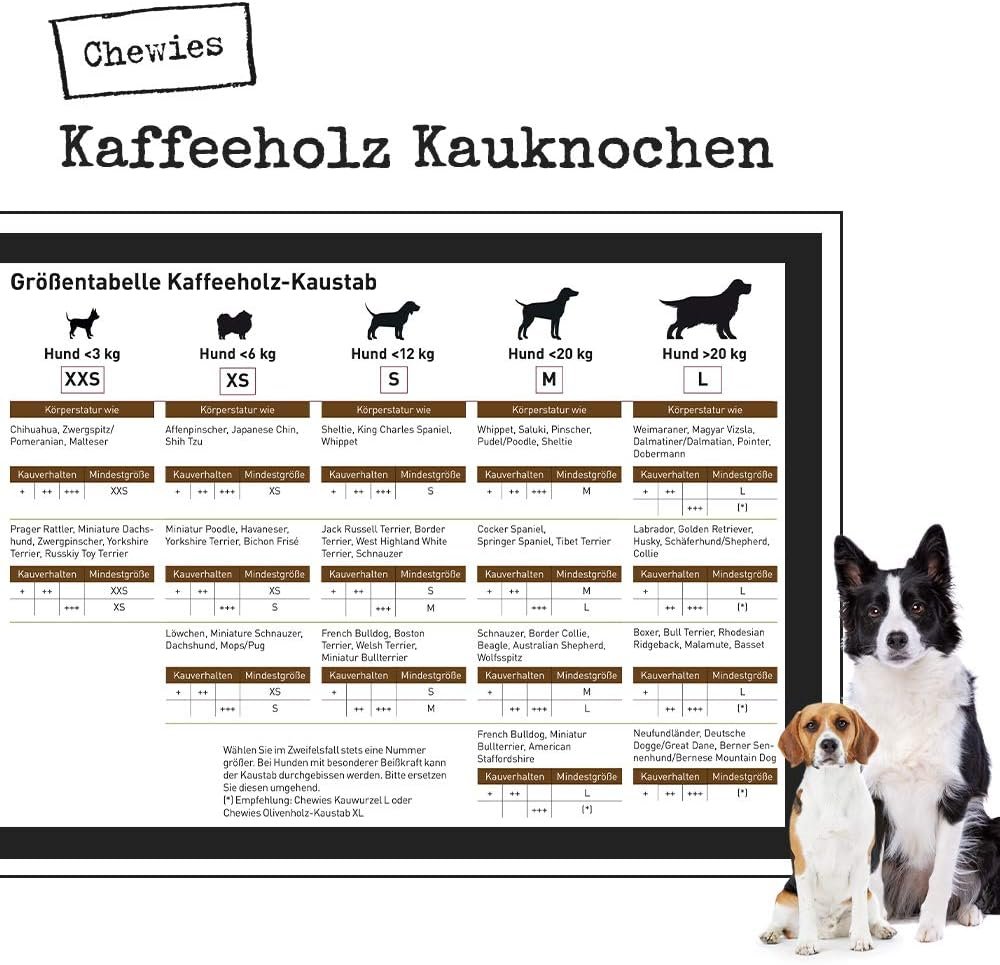 Chewies Kaffeeholz-Kaustangen sind Naturprodukte, daher unterscheiden sich Form, Größe, Farbe und Gewicht. Sie bestehen zu 100 % aus dem besonders harten Holz des Kaffeebaums. Bitte wie jedes Spielzeug nur unter Aufsicht verwenden. Ihr Hund wird ein besonders langes und sättigendes Kauvergnügen haben. Chewies – 100 % Hund!